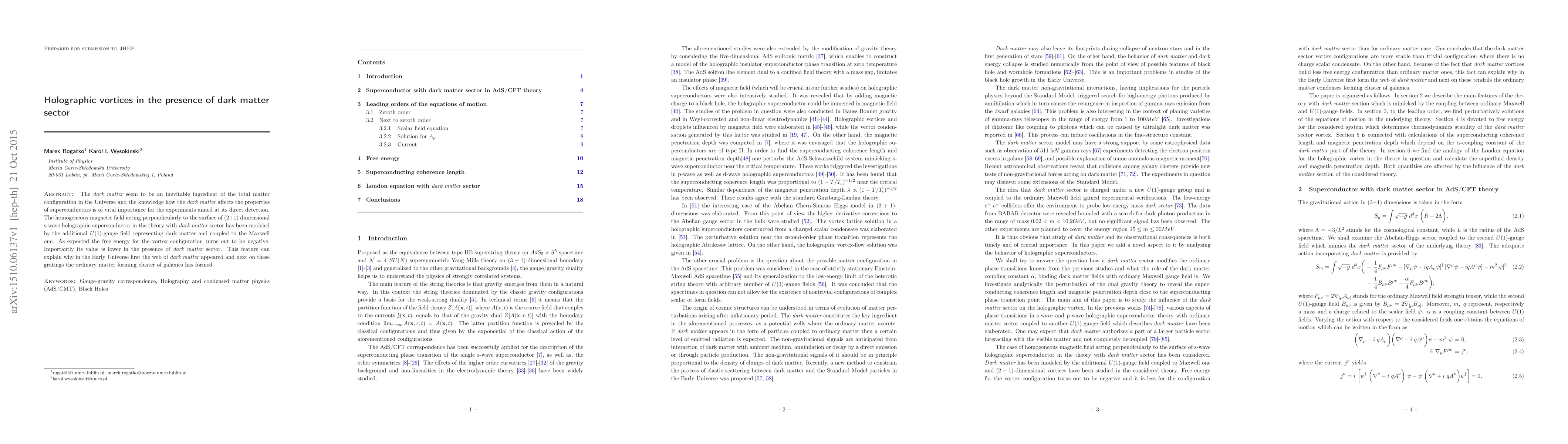 The {\it dark matter} seem to be an inevitable ingredient of the total matter configuration in the Universe and the knowledge how the {\it dark matter} affects the properties of superconductors is of vital importance for the experiments aimed at its direct detection. The homogeneous magnetic field acting perpendicularly to the surface of (2+1) dimensional s-wave holographic superconductor in the theory with {\it dark matter} sector has been modeled by the additional $U(1)$-gauge field representing dark matter and coupled to the Maxwell one. As expected the free energy for the vortex configuration turns out to be negative. Importantly its value is lower in the presence of {\it dark matter} sector. This feature can explain why in the Early Universe first the web of {\it dark matter} appeared and next on these gratings the ordinary matter forming cluster of galaxies has formed.