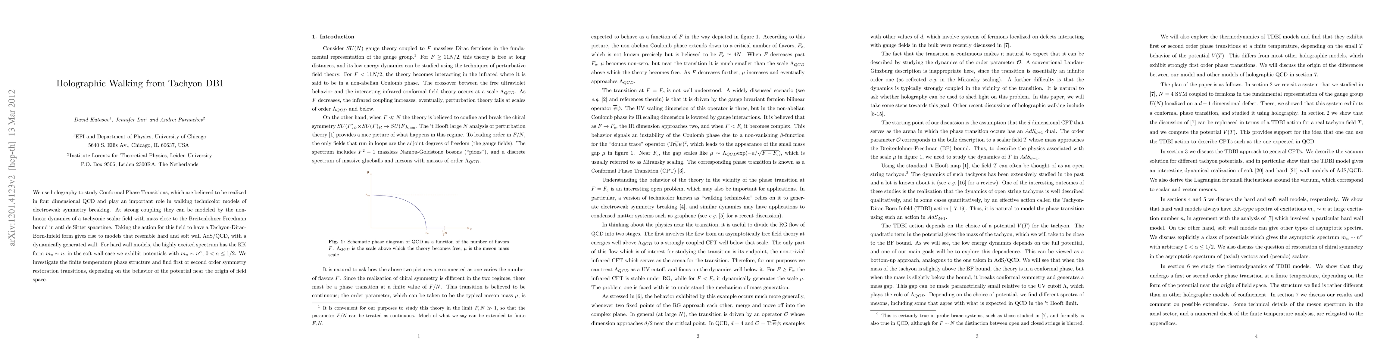 We use holography to study Conformal Phase Transitions, which are believed to be realized in four dimensional QCD and play an important role in walking technicolor models of electroweak symmetry breaking. At strong coupling they can be modeled by the non-linear dynamics of a tachyonic scalar field with mass close to the Breitenlohner-Freedman bound in anti de Sitter spacetime. Taking the action for this field to have a Tachyon-Dirac-Born-Infeld form gives rise to models that resemble hard and soft wall AdS/QCD, with a dynamically generated wall. For hard wall models, the highly excited spectrum has the KK form m_n ~ n; in the soft wall case we exhibit potentials with m_n ~ n^\alpha, 0<\alpha\leq1/2. We investigate the finite temperature phase structure and find first or second order symmetry restoration transitions, depending on the behavior of the potential near the origin of field space.