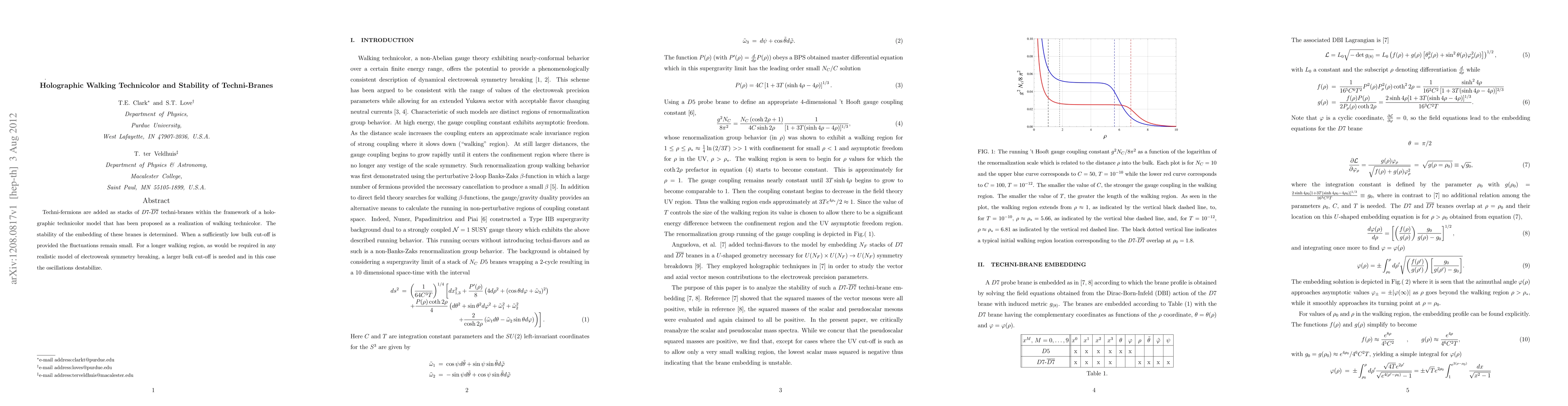 This paper explores a holographic technicolor model with techni-fermions on D7-anti-D7 techni-branes, finding that low bulk cut-offs maintain brane stability; however, longer walking regions necessitate higher cut-offs, leading to destabilization through oscillations.