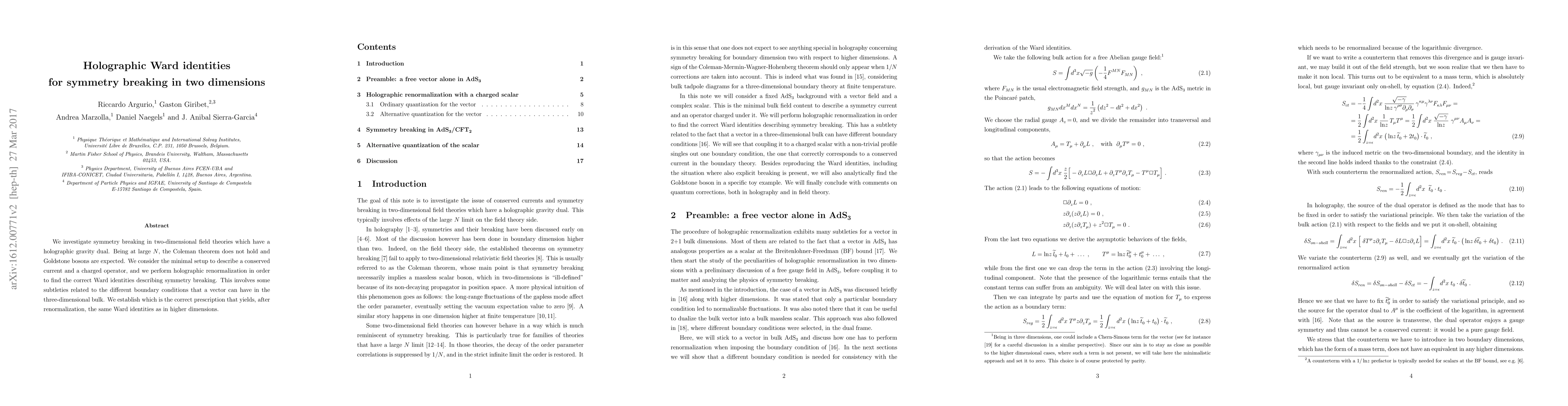 We investigate symmetry breaking in two-dimensional field theories which have a holographic gravity dual. Being at large N, the Coleman theorem does not hold and Goldstone bosons are expected. We consider the minimal setup to describe a conserved current and a charged operator, and we perform holographic renormalization in order to find the correct Ward identities describing symmetry breaking. This involves some subtleties related to the different boundary conditions that a vector can have in the three-dimensional bulk. We establish which is the correct prescription that yields, after renormalization, the same Ward identities as in higher dimensions.