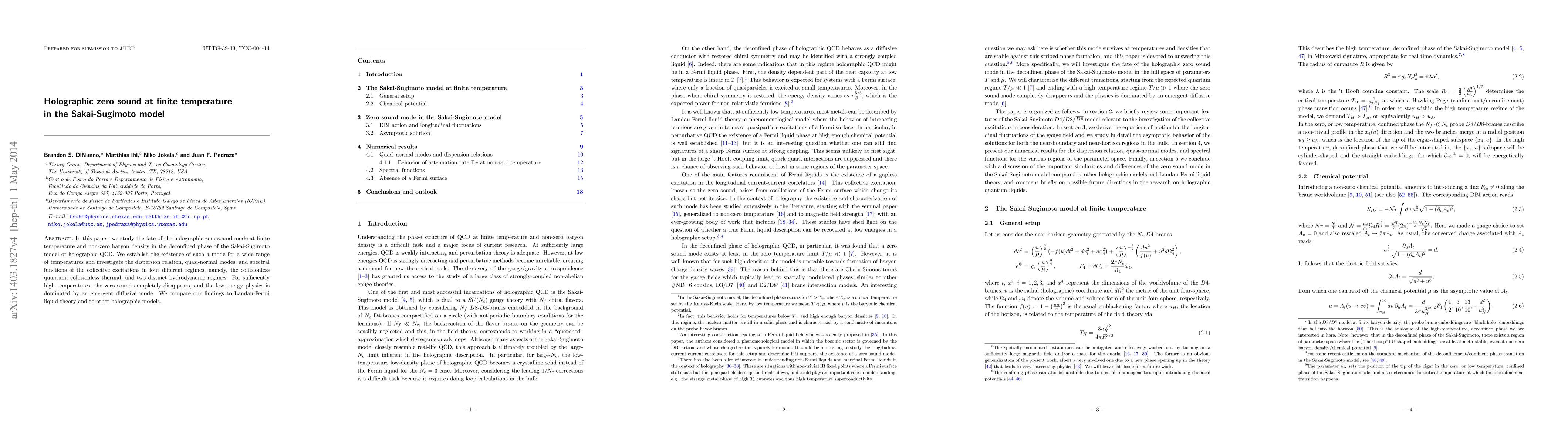 In this paper, we study the fate of the holographic zero sound mode at finite temperature and non-zero baryon density in the deconfined phase of the Sakai-Sugimoto model of holographic QCD. We establish the existence of such a mode for a wide range of temperatures and investigate the dispersion relation, quasi-normal modes, and spectral functions of the collective excitations in four different regimes, namely, the collisionless quantum, collisionless thermal, and two distinct hydrodynamic regimes. For sufficiently high temperatures, the zero sound completely disappears, and the low energy physics is dominated by an emergent diffusive mode. We compare our findings to Landau-Fermi liquid theory and to other holographic models.
