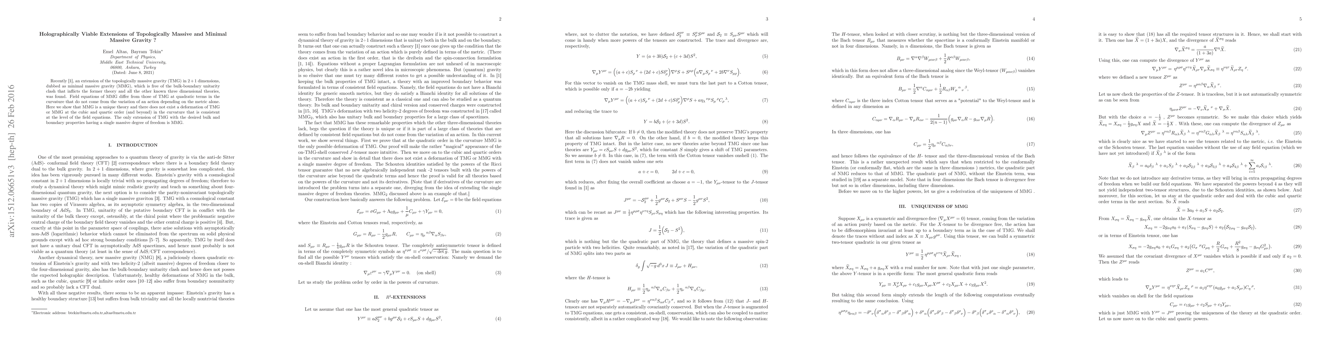 Recently, an extension of the topologically massive gravity (TMG) in $2+1$ dimensions, dubbed as minimal massive gravity (MMG), was found which is free of the bulk-boundary unitarity clash that inflicts the former theory and all the other known three dimensional theories. Field equations of MMG differ from those of TMG at quadratic terms in the curvature that do not come from the variation of an action depending on the metric alone. Here we show that MMG is a unique theory and there does not exist a deformation of TMG or MMG at the cubic and quartic order (and beyond) in the curvature that is consistent at the level of the field equations. The only extension of TMG with the desired bulk and boundary properties having a single massive degree of freedom is MMG.
