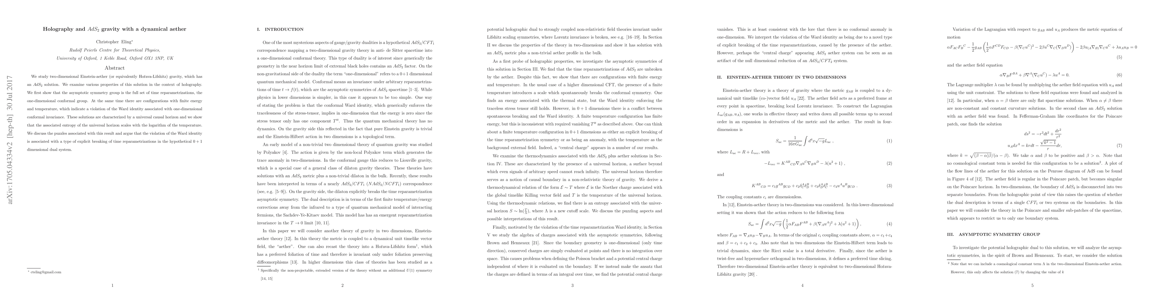 We study two-dimensional Einstein-aether (or equivalently Ho\v{r}ava-Lifshitz) gravity, which has an $AdS_2$ solution. We examine various properties of this solution in the context of holography. We first show that the asymptotic symmetry group is the full set of time reparametrizations, the one-dimensional conformal group. At the same time there are configurations with finite energy and temperature, which indicate a violation of the Ward identity associated with one-dimensional conformal invariance. These solutions are characterized by a universal causal horizon and we show that the associated entropy of the universal horizon scales with the logarithm of the temperature. We discuss the puzzles associated with this result and argue that the violation of the Ward identity is associated with a type of explicit breaking of time reparametrizations in the hypothetical $0+1$ dimensional dual system.