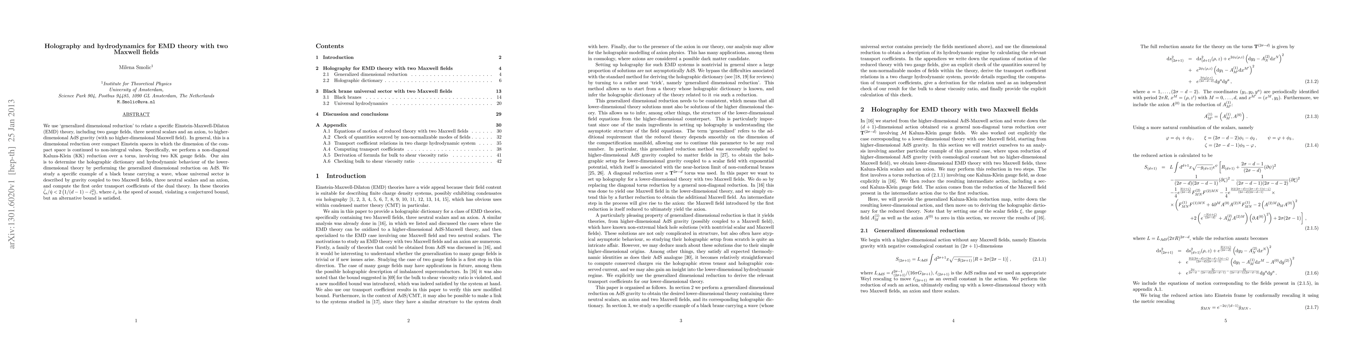 We use `generalized dimensional reduction' to relate a specific Einstein-Maxwell-Dilaton (EMD) theory, including two gauge fields, three neutral scalars and an axion, to higher-dimensional AdS gravity (with no higher-dimensional Maxwell field). In general, this is a dimensional reduction over compact Einstein spaces in which the dimension of the compact space is continued to non-integral values. Specifically, we perform a non-diagonal Kaluza-Klein (KK) reduction over a torus, involving two KK gauge fields. Our aim is to determine the holographic dictionary and hydrodynamic behaviour of the lower-dimensional theory by performing the generalized dimensional reduction on AdS. We study a specific example of a black brane carrying a wave, whose universal sector is described by gravity coupled to two Maxwell fields, three neutral scalars and an axion, and compute the first order transport coefficients of the dual theory. In these theories $\hat{\z}_s / \hat{\eta} < 2(1(d-1)-\hat{c}_s^2)$, where $\hat{c}_s$ is the speed of sound, violating a conjectured bound, but an alternative bound is satisfied.
