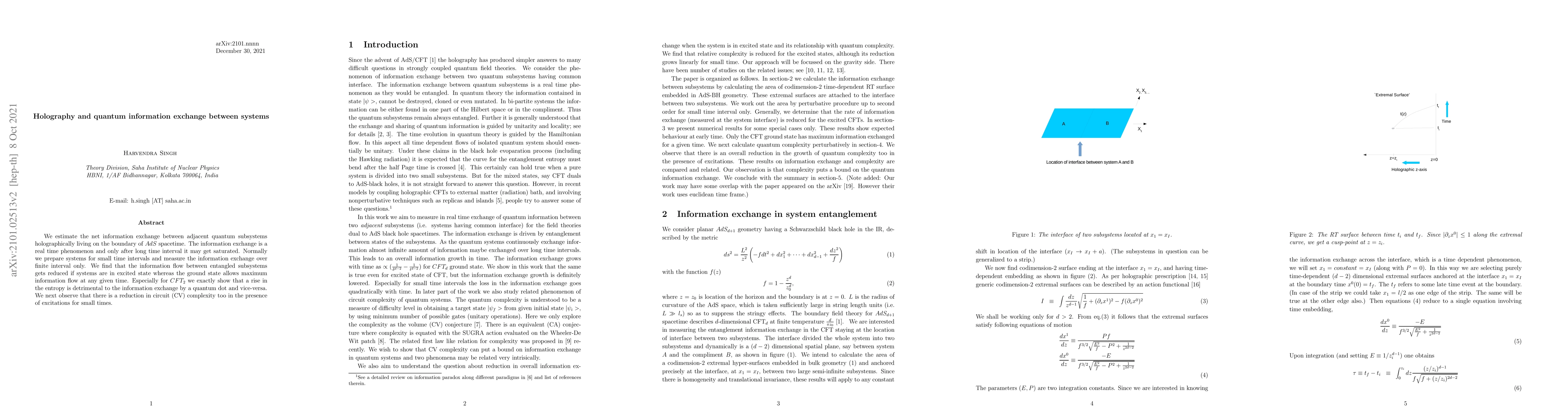 We estimate the net information exchange between adjacent quantum subsystems holographically living on the boundary of $AdS$ spacetime. The information exchange is a real time phenomenon and only after long time interval it may get saturated. Normally we prepare systems for small time intervals and measure the information exchange over finite interval only. We find that the information flow between entangled subsystems gets reduced if systems are in excited state whereas the ground state allows maximum information flow at any given time. Especially for $CFT_2$ we exactly show that a rise in the entropy is detrimental to the information exchange by a quantum dot and vice-versa. We next observe that there is a reduction in circuit (CV) complexity too in the presence of excitations for small times.