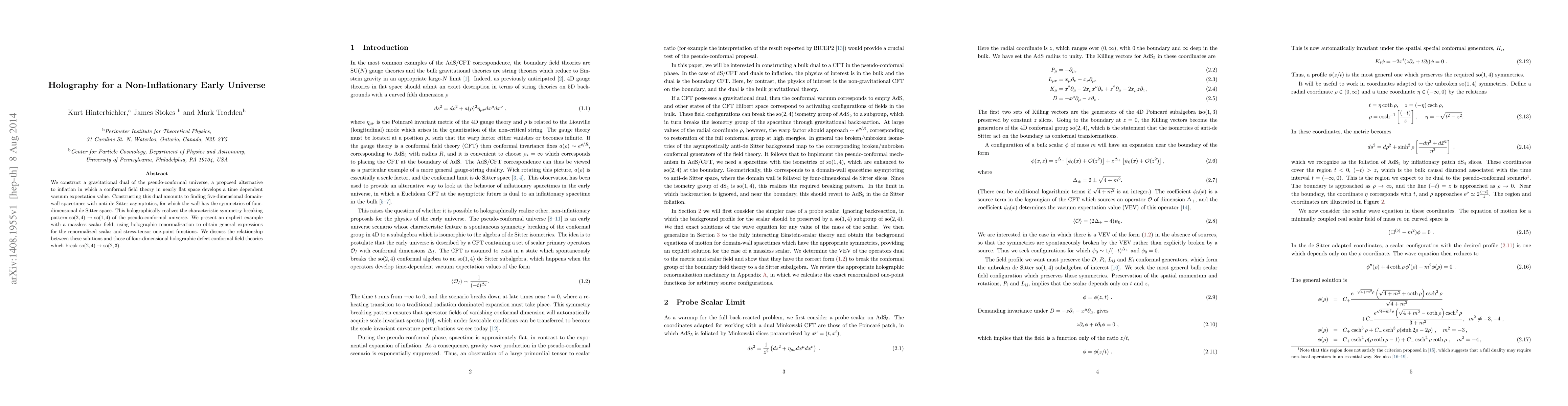 We construct a gravitational dual of the pseudo-conformal universe, a proposed alternative to inflation in which a conformal field theory in nearly flat space develops a time dependent vacuum expectation value. Constructing this dual amounts to finding five-dimensional domain-wall spacetimes with anti-de Sitter asymptotics, for which the wall has the symmetries of four-dimensional de Sitter space. This holographically realizes the characteristic symmetry breaking pattern O(2,4) to O(1,4) of the pseudo-conformal universe. We present an explicit example with a massless scalar field, using holographic renormalization to obtain general expressions for the renormalized scalar and stress-tensor one-point functions. We discuss the relationship between these solutions and those of four-dimensional holographic defect conformal field theories which break O(2,4) to O(2,3)