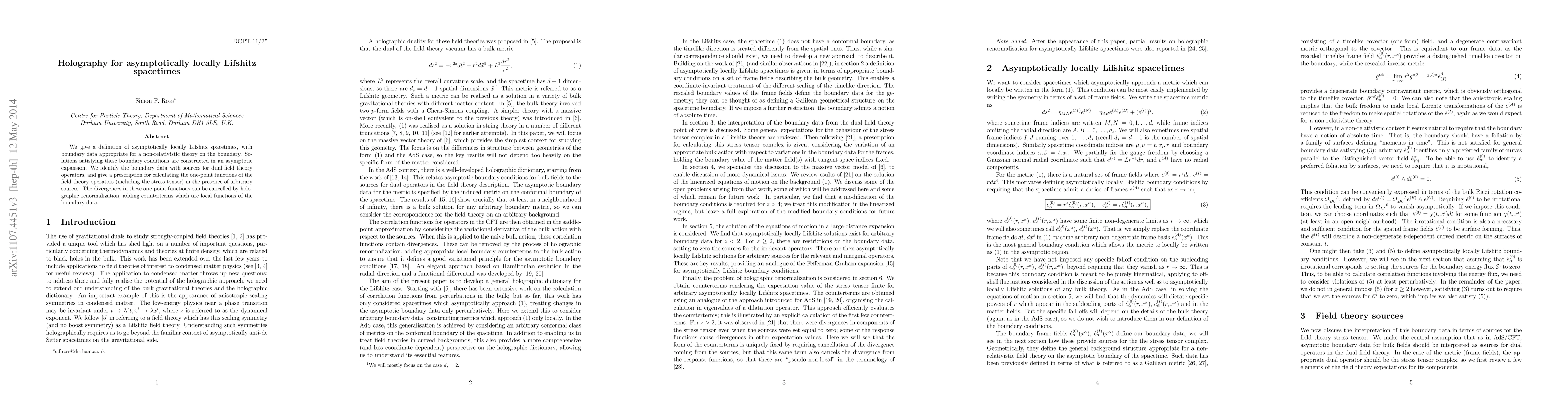 This paper defines asymptotically locally Lifshitz spacetimes and constructs solutions with appropriate boundary conditions for a non-relativistic boundary theory. It provides a method for calculating field theory one-point functions, including the stress tensor, and uses holographic renormalization to cancel divergences.