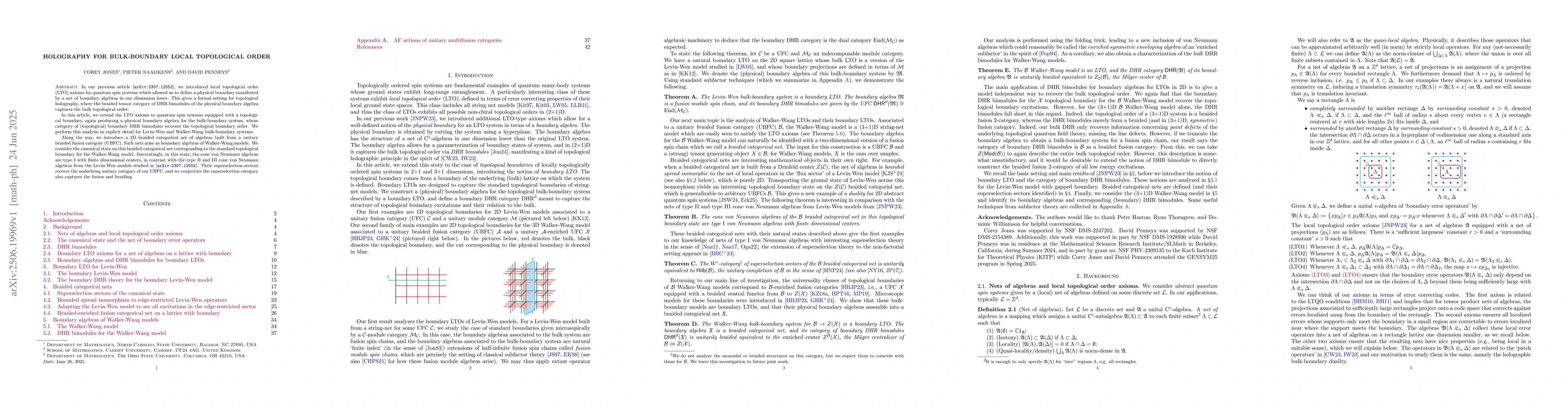 In our previous article [arXiv:2307.12552], we introduced local topological order (LTO) axioms for quantum spin systems which allowed us to define a physical boundary manifested by a net of boundary algebras in one dimension lower. This gives a formal setting for topological holography, where the braided tensor category of DHR bimodules of the physical boundary algebra captures the bulk topological order. In this article, we extend the LTO axioms to quantum spin systems equipped with a topological boundary, again producing a physical boundary algebra for the bulk-boundary system, whose category of (topological) boundary DHR bimodules recovers the topological boundary order. We perform this analysis in explicit detail for Levin-Wen and Walker-Wang bulk-boundary systems. Along the way, we introduce a 2D braided categorical net of algebras built from a unitary braided fusion category (UBFC). Such nets arise as boundary algebras of Walker-Wang models. We consider the canonical state on this braided categorical net corresponding to the standard topological boundary for the Walker-Wang model. Interestingly, in this state, the cone von Neumann algebras are type I with finite dimensional centers, in contrast with the type II and III cone von Neumann algebras from the Levin-Wen models studied in [arXiv:2307.12552]. Their superselection sectors recover the underlying unitary category of our UBFC, and we conjecture the superselection category also captures the fusion and braiding.