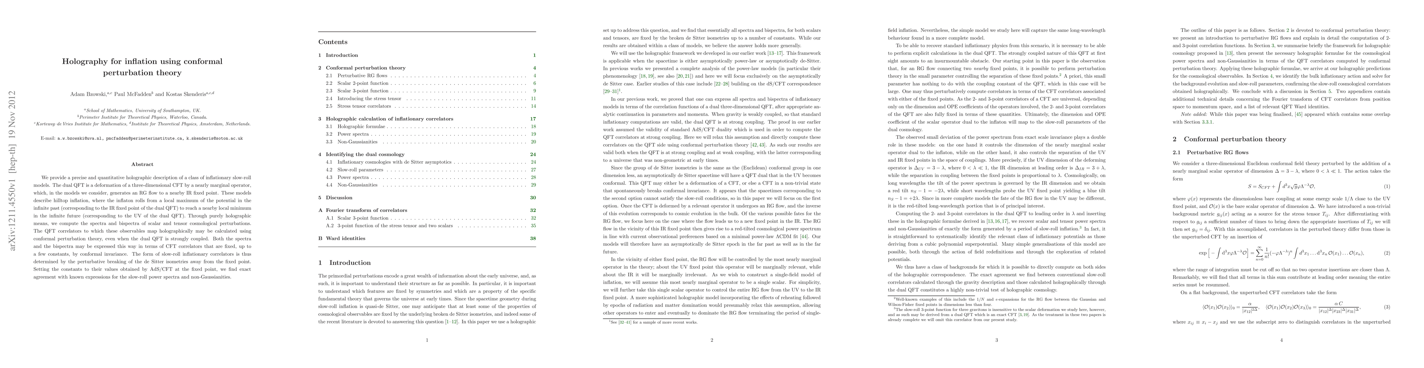 This paper uses holography to describe inflationary slow-roll models, calculating spectra and bispectra of cosmic perturbations through conformal perturbation theory, achieving exact agreement with known expressions.