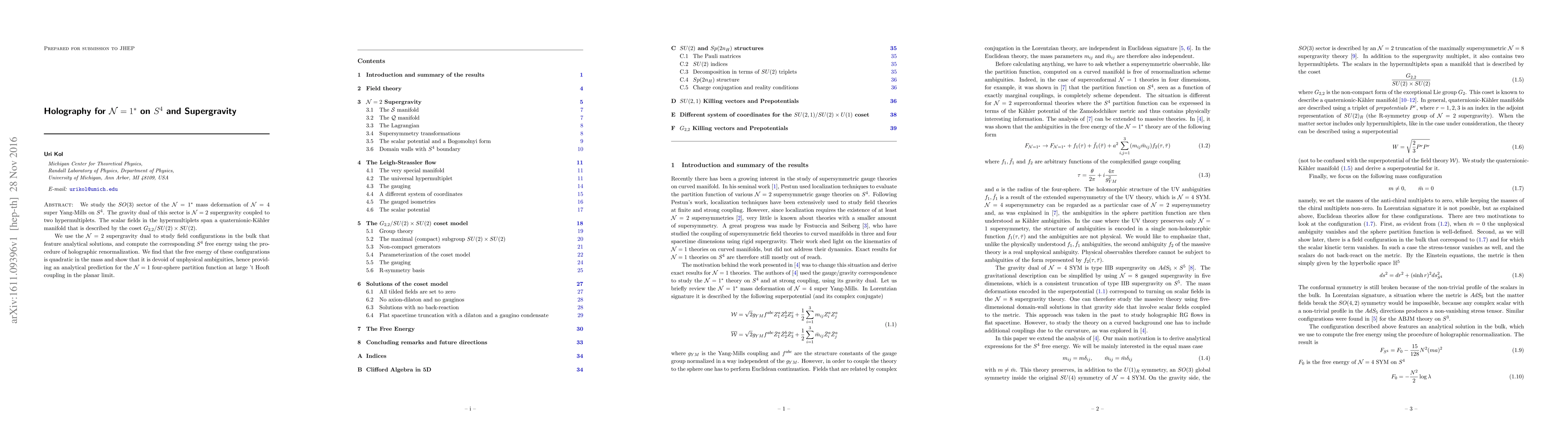 This paper investigates the $SO(3)$ sector of $\mathcal{N}=1^*$ deformed $\mathcal{N}=4$ super Yang-Mills on $S^4$ and its supergravity dual, $\mathcal{N}=2$ supergravity coupled to two hypermultiplets. The authors compute the $S^4$ free energy using holographic renormalization, revealing a quadratic dependence on mass and confirming the absence of unphysical ambiguities, thus analytically predicting the $\mathcal{N}=1$ four-sphere partition function at large 't Hooft coupling.
