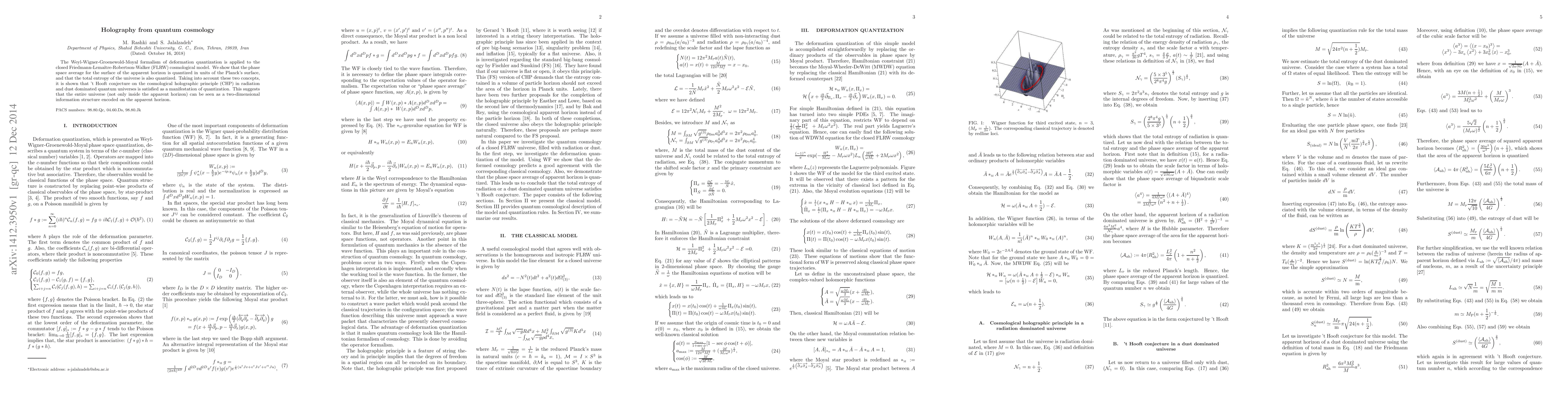 The Weyl-Wigner-Groenewold-Moyal formalism of deformation quantization is applied to the closed Friedmann-Lema\^itre-Robertson-Walker (FLRW) cosmological model. We show that the phase space average for the surface of the apparent horizon is quantized in units of the Planck's surface, and that the total entropy of the universe is also quantized. Taking into account these two concepts, it is shown that 't Hooft conjecture on the cosmological holographic principle (CHP) in radiation and dust dominated quantum universes is satisfied as a manifestation of quantization. This suggests that the entire universe (not only inside the apparent horizon) can be seen as a two-dimensional information structure encoded on the apparent horizon.