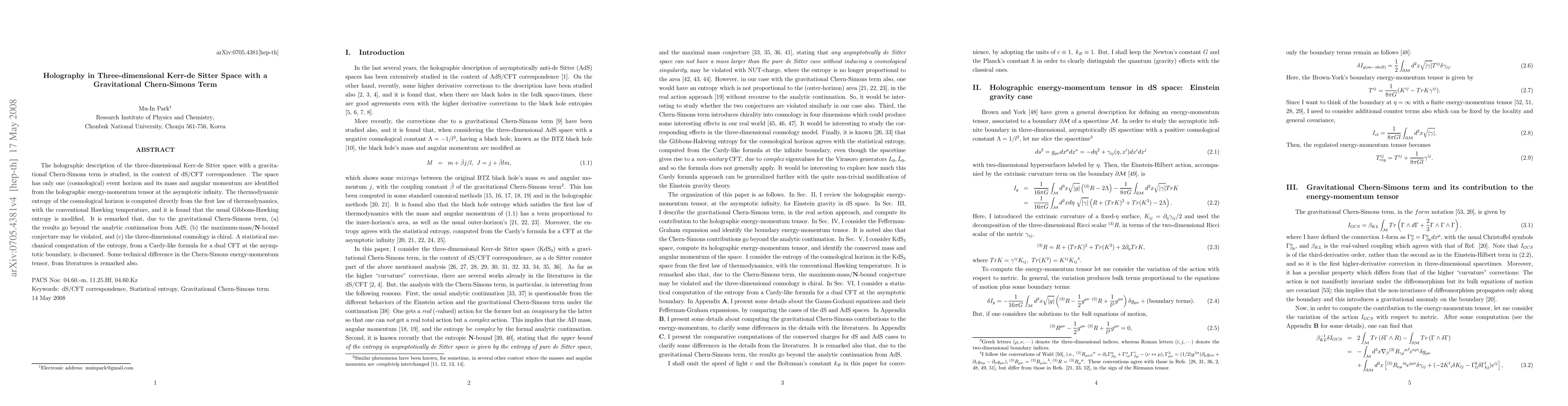 This paper explores the holographic description of three-dimensional Kerr-de Sitter space, incorporating a gravitational Chern-Simons term, within the framework of the dS/CFT correspondence. It finds that the thermodynamic entropy of the cosmological horizon is modified, with implications for analytic continuation, the maximum-mass/N-bound conjecture, and chiral cosmology.