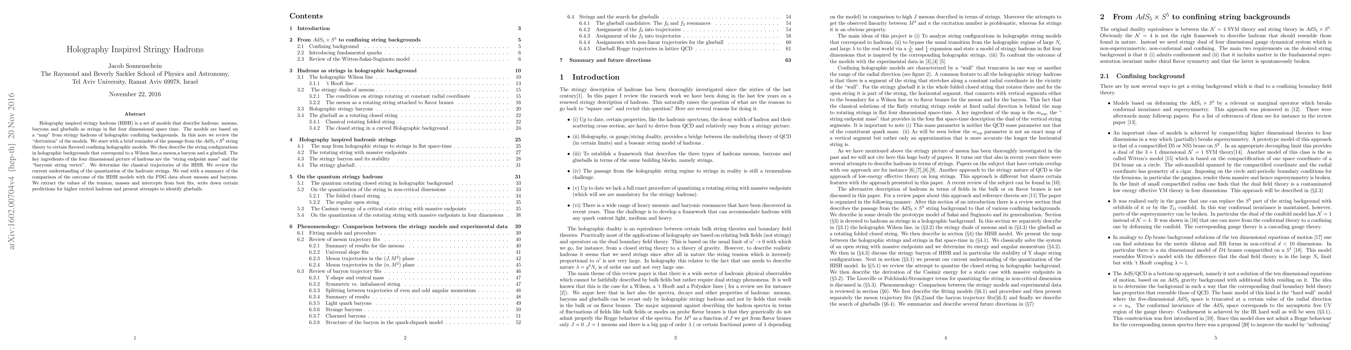 This paper reviews holographic inspired stringy hadrons (HISH) models that describe mesons, baryons, and glueballs as strings in four-dimensional space-time. The models derive from holographic confining backgrounds and include key elements like the "string endpoint mass" and "baryonic string vertex," with a focus on comparing model predictions to PDG data and identifying glueballs.