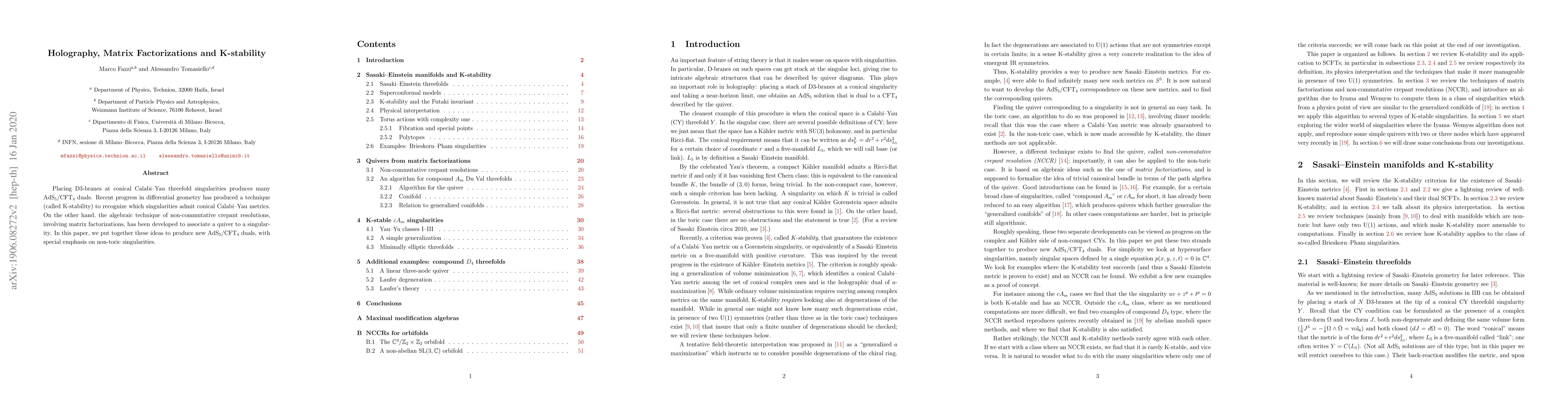This paper combines K-stability and matrix factorizations to create new AdS$_5$/CFT$_4$ duals, particularly for non-toric singularities, using conical Calabi-Yau metrics.