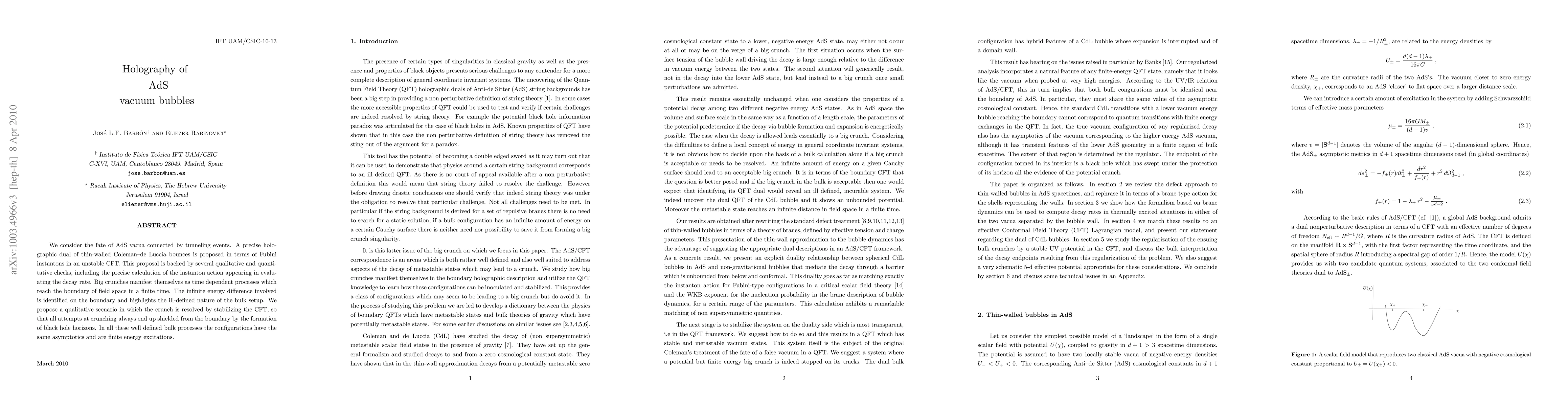 We consider the fate of AdS vacua connected by tunneling events. A precise holographic dual of thin-walled Coleman--de Luccia bounces is proposed in terms of Fubini instantons in an unstable CFT. This proposal is backed by several qualitative and quantitative checks, including the precise calculation of the instanton action appearing in evaluating the decay rate. Big crunches manifest themselves as time dependent processes which reach the boundary of field space in a finite time. The infinite energy difference involved is identified on the boundary and highlights the ill-defined nature of the bulk setup. We propose a qualitative scenario in which the crunch is resolved by stabilizing the CFT, so that all attempts at crunching always end up shielded from the boundary by the formation of black hole horizons. In all these well defined bulk processes the configurations have the same asymptotics and are finite energy excitations.