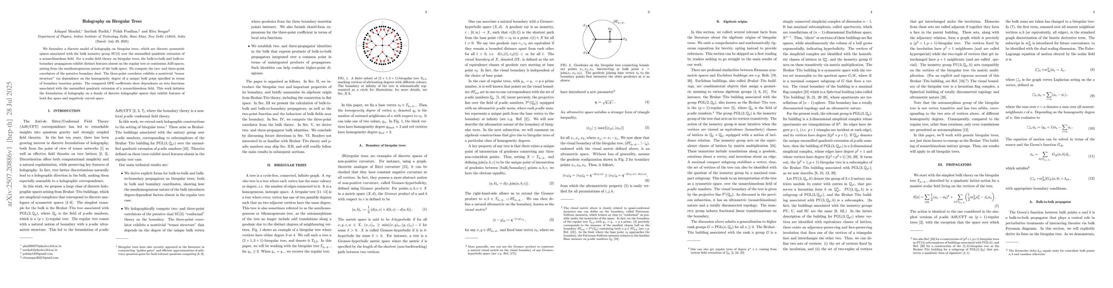 We formulate a discrete model of holography on biregular trees, which are discrete symmetric spaces associated with the bulk isometry group SU(3) over the unramified quadratic extension of a nonarchimedean field. For a scalar field theory on biregular trees, the bulk-to-bulk and bulk-to-boundary propagators exhibit distinct features absent on the regular tree or continuum AdS spaces, arising from the semihomogeneous nature of the bulk space. We compute the two- and three-point correlators of the putative boundary dual. The three-point correlator exhibits a nontrivial "tensor structure" via dependence on the homogeneity degree of a unique bulk point specified in terms of boundary insertion points. The computed OPE coefficients show dependence on zeta functions associated with the unramified quadratic extension of a nonarchimedean field. This work initiates the formulation of holography on a family of discrete holographic spaces that exhibit features of both flat space and negatively curved space.