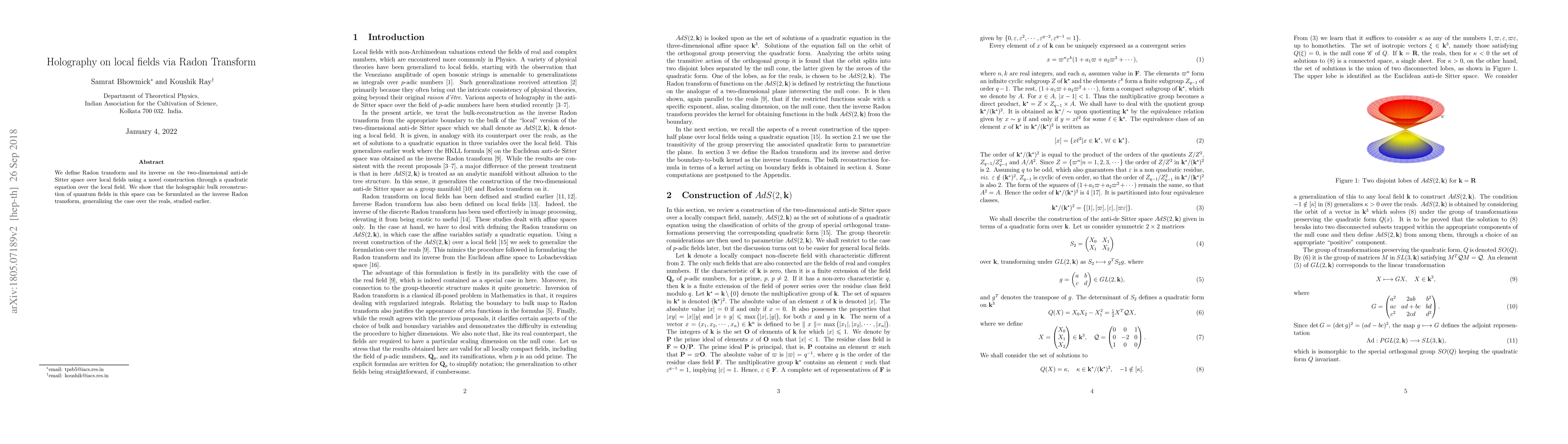This paper introduces a novel Radon transform for two-dimensional anti-de Sitter space over local fields, enabling holographic bulk reconstruction of quantum fields via the inverse Radon transform, extending previous results from real-space studies.