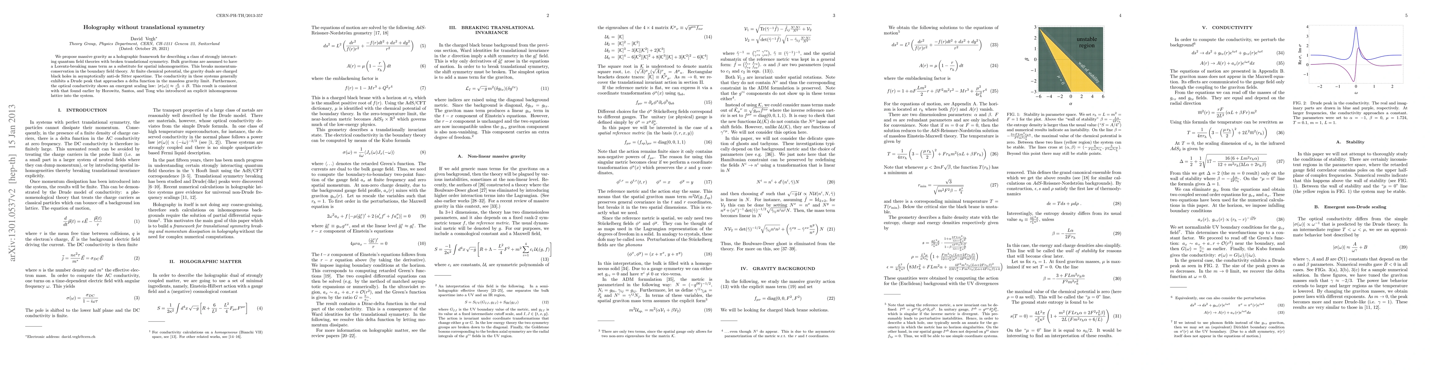 This paper proposes massive gravity as a holographic framework for describing strongly interacting quantum field theories with broken translational symmetry, using Lorentz-breaking gravitons to simulate spatial inhomogeneities. The study finds that the optical conductivity exhibits a Drude peak and an emergent scaling law, consistent with previous results from inhomogeneous lattice models.