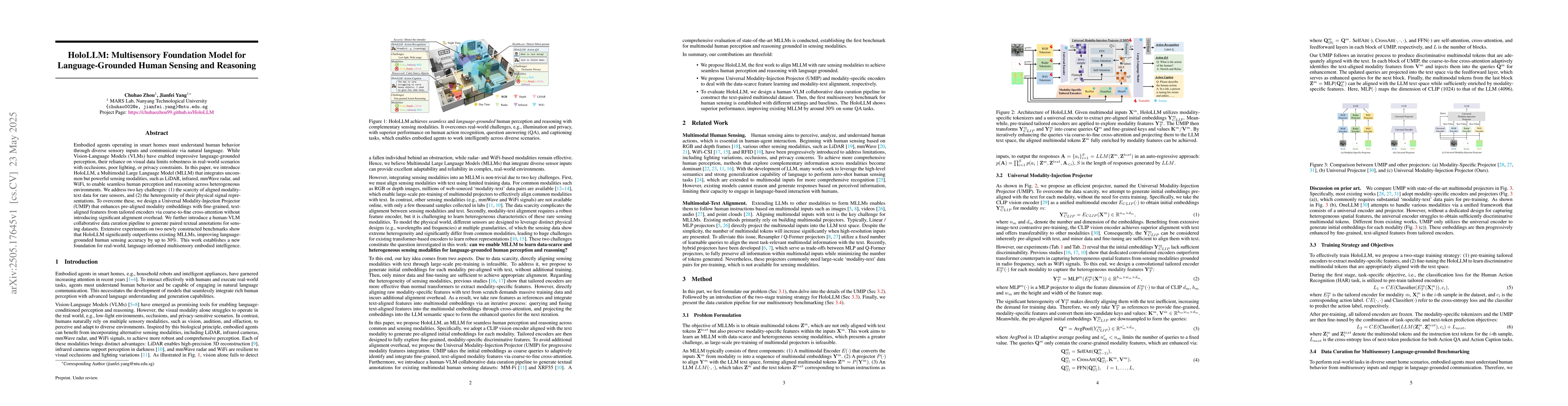 Embodied agents operating in smart homes must understand human behavior through diverse sensory inputs and communicate via natural language. While Vision-Language Models (VLMs) have enabled impressive language-grounded perception, their reliance on visual data limits robustness in real-world scenarios with occlusions, poor lighting, or privacy constraints. In this paper, we introduce HoloLLM, a Multimodal Large Language Model (MLLM) that integrates uncommon but powerful sensing modalities, such as LiDAR, infrared, mmWave radar, and WiFi, to enable seamless human perception and reasoning across heterogeneous environments. We address two key challenges: (1) the scarcity of aligned modality-text data for rare sensors, and (2) the heterogeneity of their physical signal representations. To overcome these, we design a Universal Modality-Injection Projector (UMIP) that enhances pre-aligned modality embeddings with fine-grained, text-aligned features from tailored encoders via coarse-to-fine cross-attention without introducing significant alignment overhead. We further introduce a human-VLM collaborative data curation pipeline to generate paired textual annotations for sensing datasets. Extensive experiments on two newly constructed benchmarks show that HoloLLM significantly outperforms existing MLLMs, improving language-grounded human sensing accuracy by up to 30%. This work establishes a new foundation for real-world, language-informed multisensory embodied intelligence.