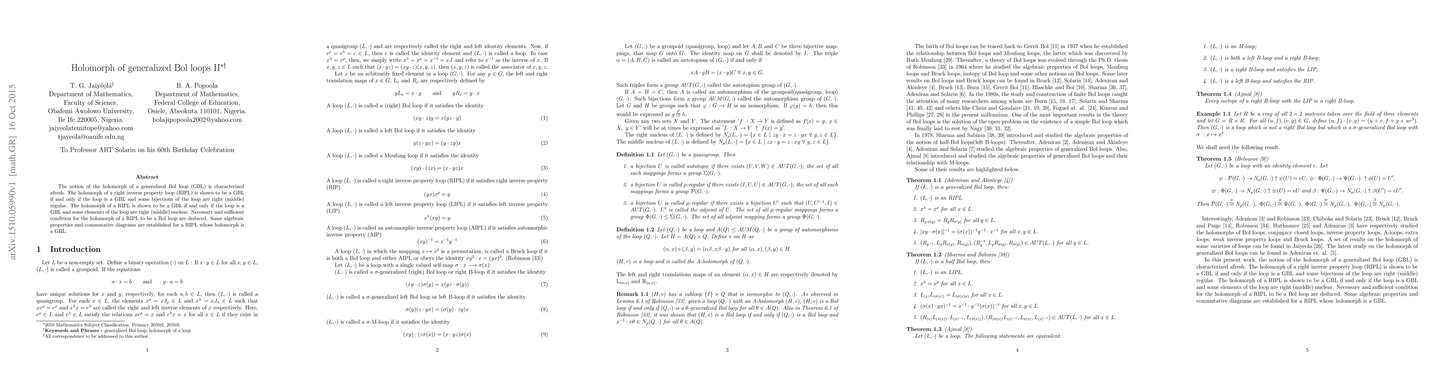 The notion of the holomorph of a generalized Bol loop (GBL) is characterized afresh. The holomorph of a right inverse property loop (RIPL) is shown to be a GBL if and only if the loop is a GBL and some bijections of the loop are right (middle) regular. The holomorph of a RIPL is shown to be a GBL if and only if the loop is a GBL and some elements of the loop are right (middle) nuclear. Necessary and sufficient condition for the holomorph of a RIPL to be a Bol loop are deduced. Some algebraic properties and commutative diagrams are established for a RIPL whose holomorph is a GBL.