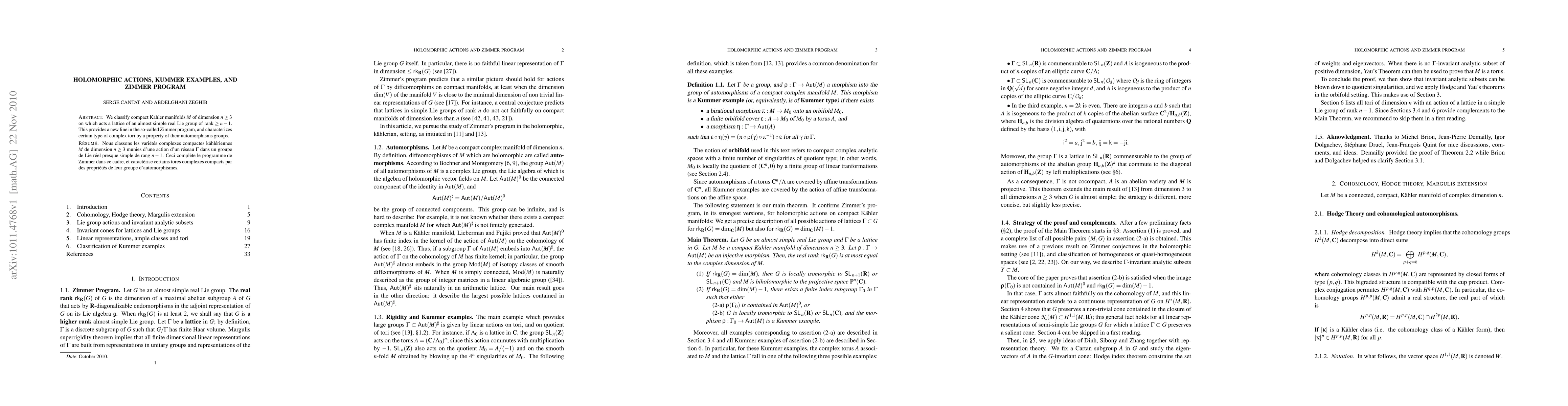 This paper classifies compact Kähler manifolds with lattice actions from almost simple real Lie groups, contributing to the Zimmer Program, and identifies specific complex tori based on their automorphism group properties.
