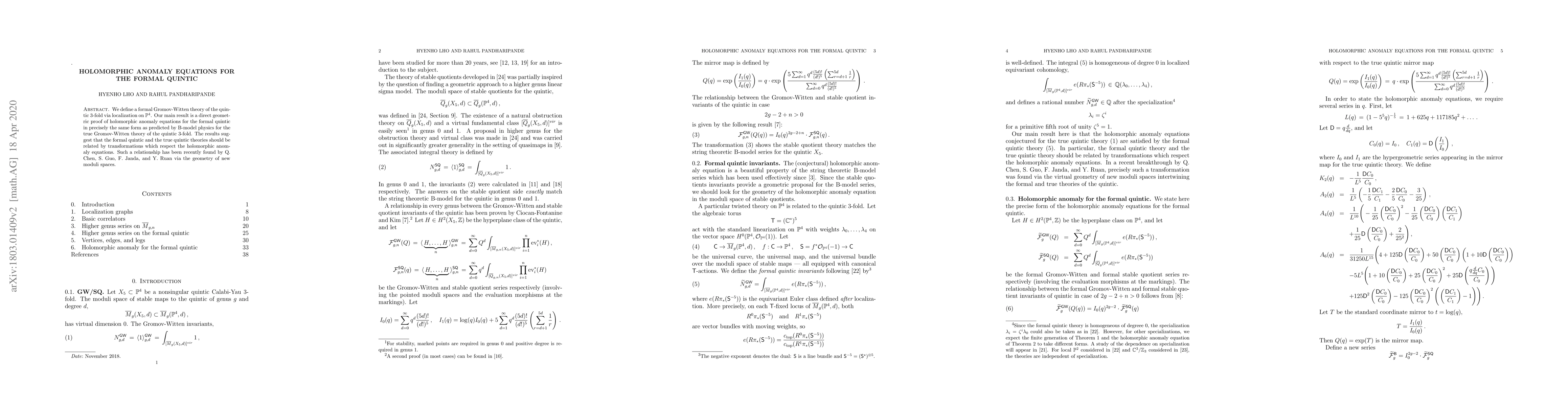 The paper provides a geometric proof of holomorphic anomaly equations for the formal quintic via localization on CP4, aligning with predictions from B-model physics for the true quintic's Gromov-Witten theory. It suggests a connection between the formal and true quintic theories through transformations respecting these equations, corroborated by recent findings in new moduli spaces.