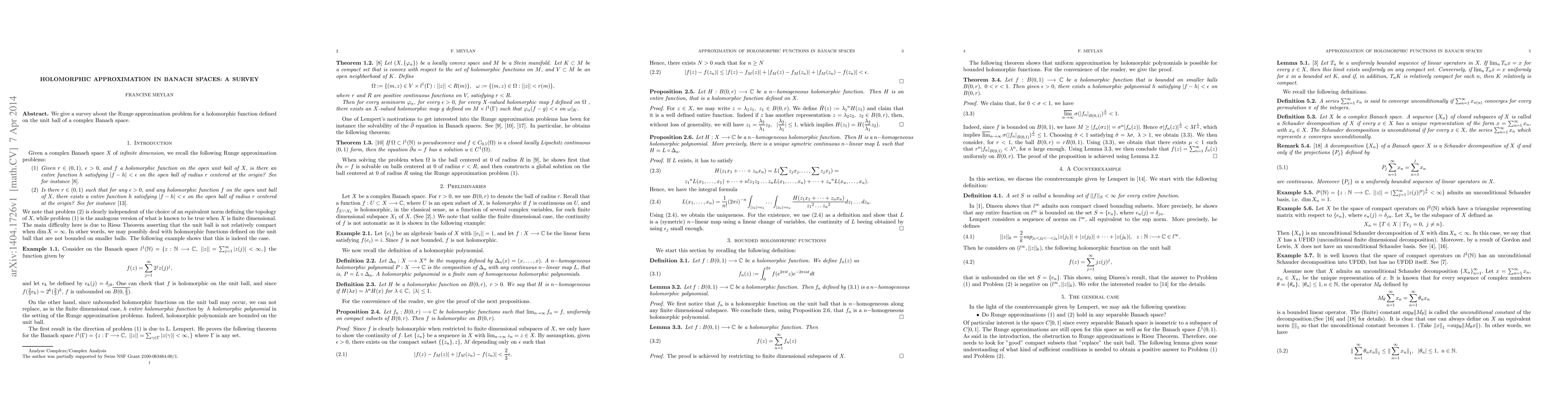 Summary: This paper surveys the Runge approximation problem for holomorphic functions within the unit ball of a complex Banach space, exploring the conditions under which such functions can be approximated by polynomials.