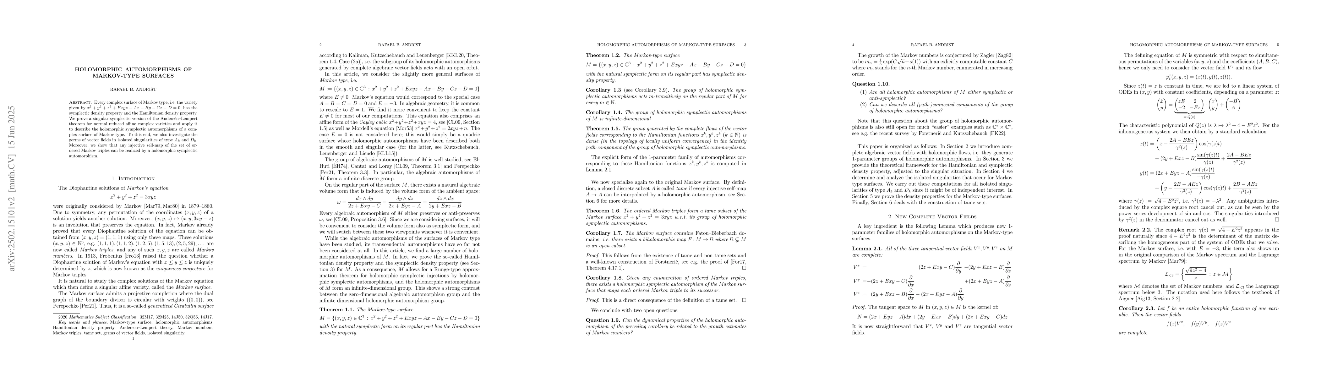 This paper establishes the holomorphic symplectic automorphisms of Markov-type surfaces using a singular version of the Andersén-Lempert theorem and examines vector fields in isolated singularities of type $A_k$ and $D_k$. It demonstrates that any injective self-map of the ordered Markov triples can be achieved via a holomorphic symplectic automorphism.