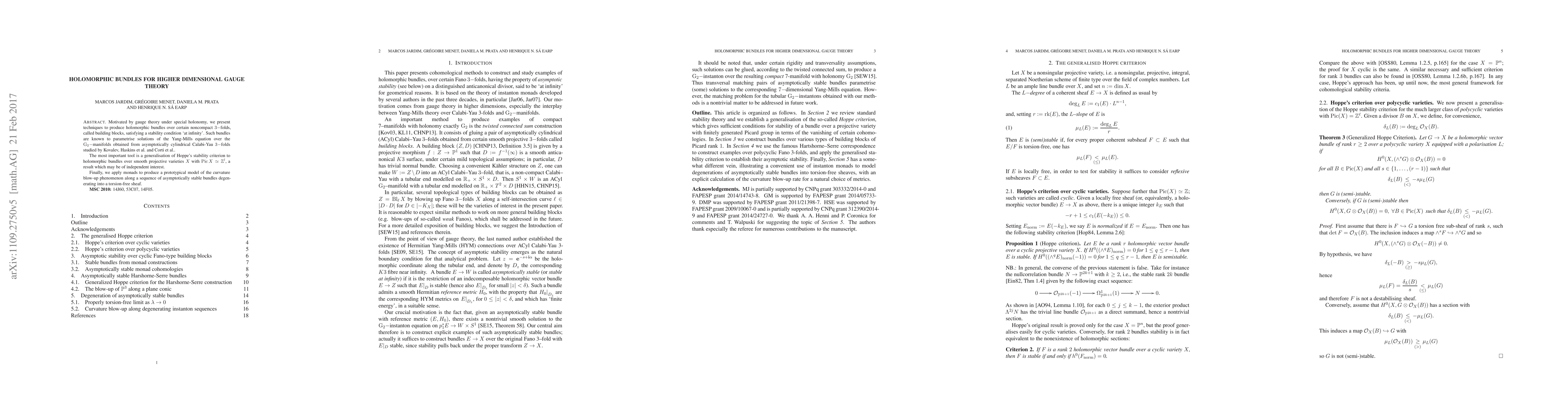 Motivated by gauge theory under special holonomy, we present techniques to produce holomorphic bundles over certain noncompact $3-$folds, called building blocks, satisfying a stability condition `at infinity'. Such bundles are known to parametrise solutions of the Yang-Mills equation over the $\rm G_2-$manifolds obtained from asymptotically cylindrical Calabi-Yau $3-$folds studied by Kovalev and by Corti-Haskins-Nordstr\"om-Pacini et al. The most important tool is a generalisation of Hoppe's stability criterion to holomorphic bundles over smooth projective varieties $X$ with $\operatorname{Pic}{X}\simeq\mathbb{Z}^l$, a result which may be of independent interest. Finally, we apply monads to produce a prototypical model of the curvature blow-up phenomenon along a sequence of asymptotically stable bundles degenerating into a torsion-free sheaf.