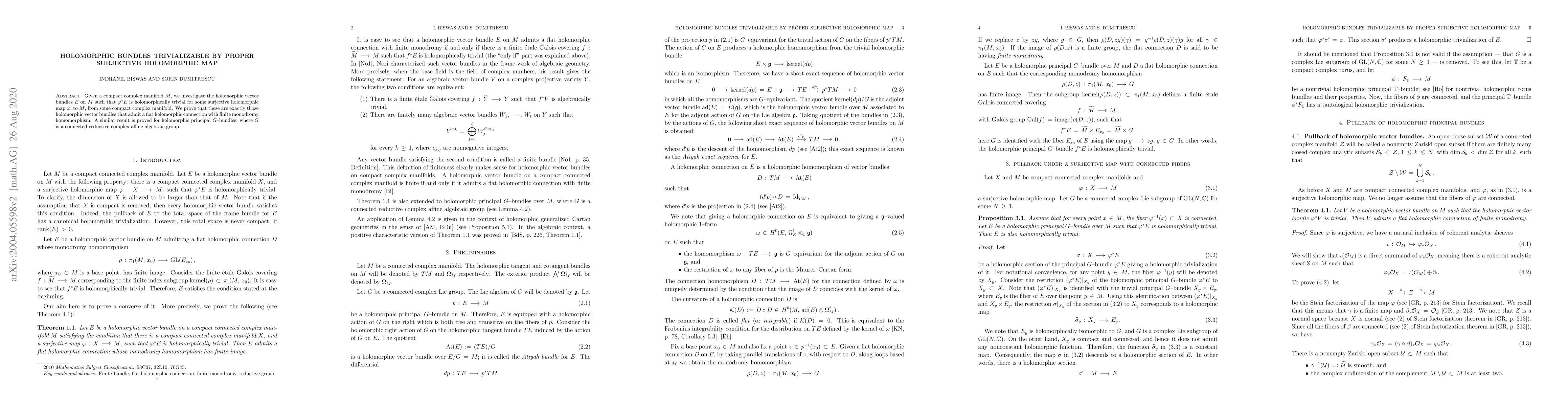 This paper examines holomorphic vector bundles on a compact complex manifold $M$ that can be trivialized by a proper holomorphic map from another compact complex manifold. It establishes that such bundles possess a flat holomorphic connection with finite monodromy, extending this result to holomorphic principal $G$-bundles for connected reductive groups $G$.