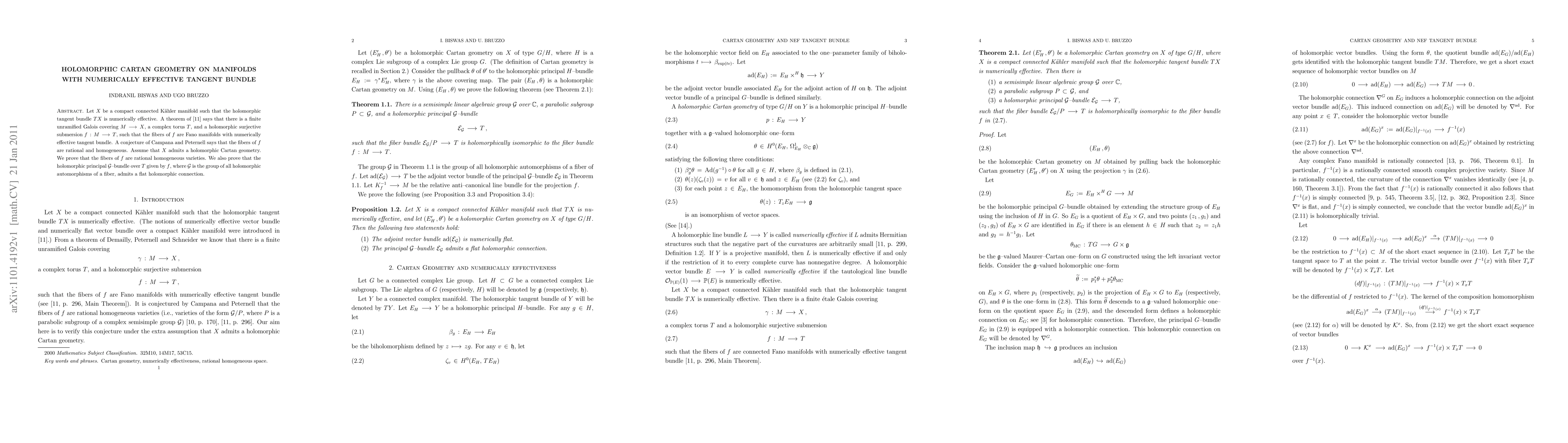 The paper proves that on a compact Kähler manifold with numerically effective holomorphic tangent bundle, if it admits a holomorphic Cartan geometry, then the fibers of a certain covering map are rational homogeneous varieties. Additionally, it establishes the existence of a flat holomorphic connection on the principal G-bundle associated with the covering.