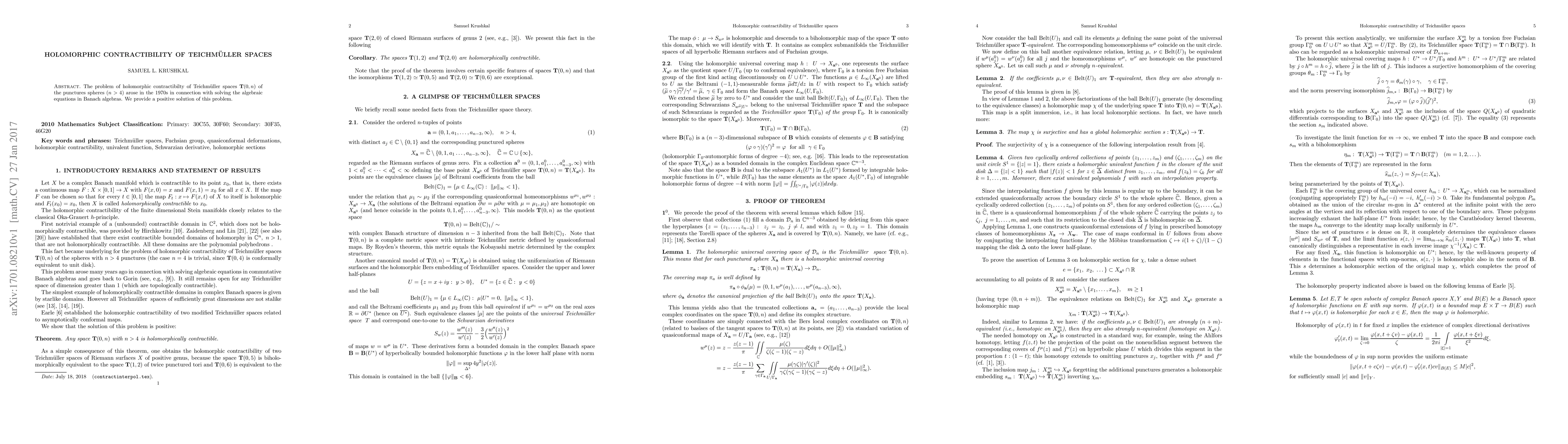 This paper provides a positive solution to the problem of holomorphic contractibility of Teichm"uller spaces for punctured spheres with n > 4, arising from connections to Banach algebra equations.