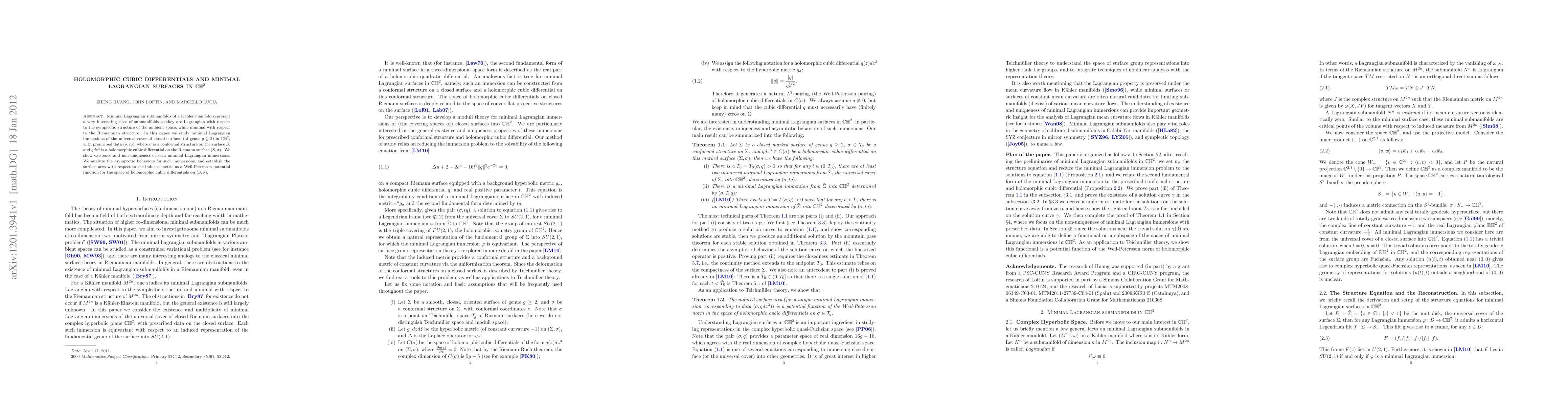 The paper employs a combination of analytical techniques, variational methods, and the implicit function theorem to study minimal Lagrangian immersions of the universal cover of a closed surface into CH2, prescribed by conformal structure and holomorphic cubic differentials.