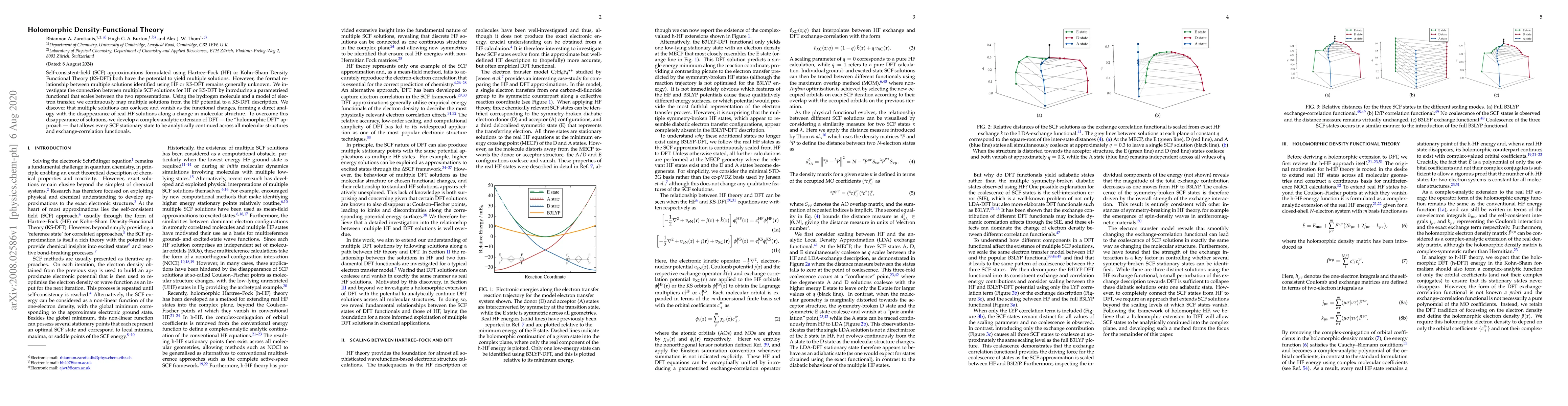 Self-consistent-field (SCF) approximations formulated using Hartree-Fock (HF) or Kohn-Sham Density Functional Theory (KS-DFT) both have the potential to yield multiple solutions. However, the formal relationship between multiple solutions identified using HF or KS-DFT remains generally unknown. We investigate the connection between multiple SCF solutions for HF or KS-DFT by introducing a parametrised functional that scales between the two representations. Using the hydrogen molecule and a model of electron transfer, we continuously map multiple solutions from the HF potential to a KS-DFT description. We discover that multiple solutions can coalesce and vanish as the functional changes, forming a direct analogy with the disappearance of real HF solutions along a change in molecular structure. To overcome this disappearance of solutions, we develop a complex-analytic extension of DFT - the "holomorphic DFT" approach - that allows every SCF stationary state to be analytically continued across all molecular structures and exchange-correlation functionals.