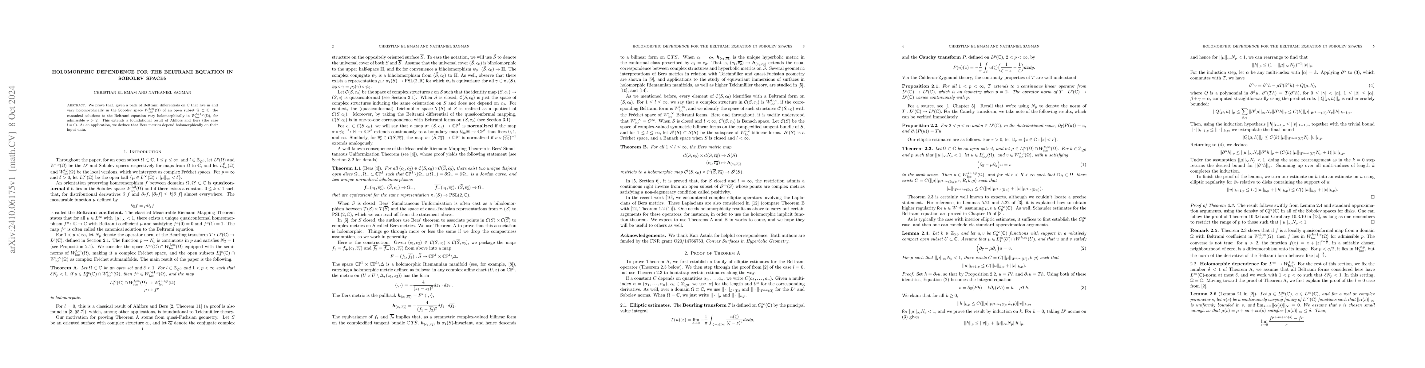 We prove that, given a path of Beltrami differentials on $\mathbb C$ that live in and vary holomorphically in the Sobolev space $W^{l,\infty}_{loc}(\Omega)$ of an open subset $\Omega\subset \mathbb C$, the canonical solutions to the Beltrami equation vary holomorphically in $W^{l+1,p}_{loc}(\Omega)$ for admissible $p > 2$. This extends a foundational result of Ahlfors and Bers (the case $l = 0$). As an application, we deduce that Bers metrics on surfaces depend holomorphically on their input data.