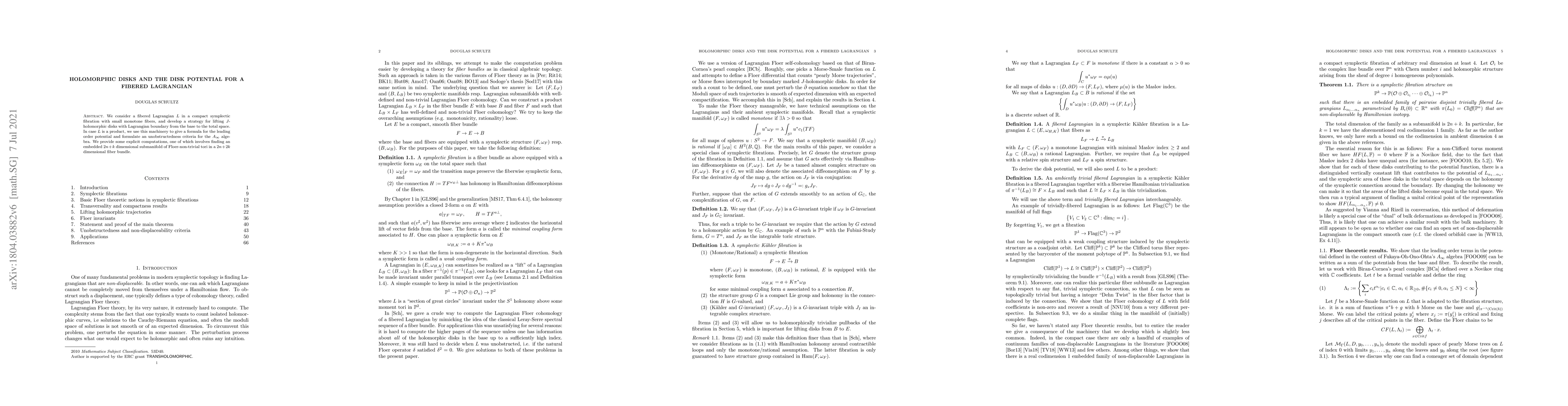 This paper develops a method to lift $J$-holomorphic disks with Lagrangian boundary from the base to the total space of a compact symplectic fibration, and applies this to a product fibered Lagrangian to derive a leading order potential formula and an unobstructedness criterion for the $A_\infty$ algebra, including explicit computations in fiber bundles.