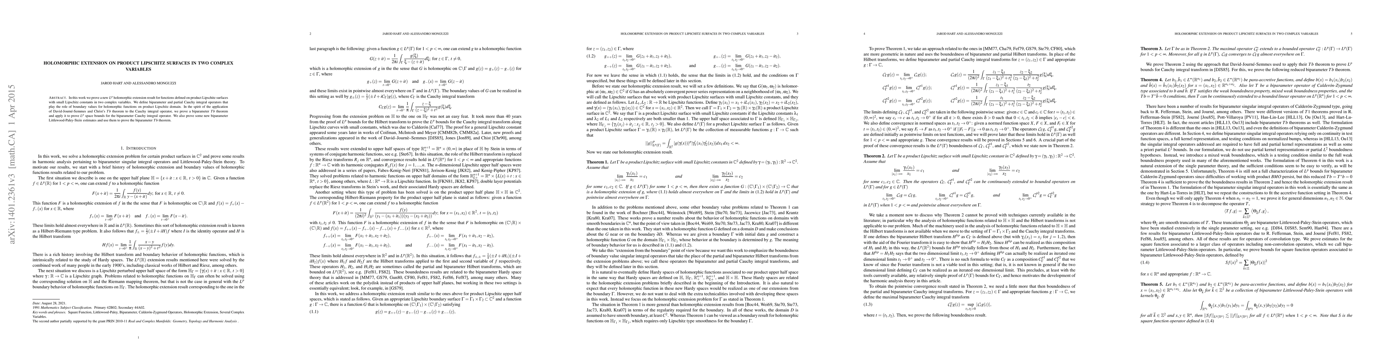 This paper establishes a new $L^p$ holomorphic extension result for functions defined on product Lipschitz surfaces in two complex variables. It introduces biparameter and partial Cauchy integral operators, proves a biparameter $Tb$ theorem, and applies it to derive $L^p$ bounds for the biparameter Cauchy integral operator, utilizing new biparameter Littlewood-Paley-Stein estimates.