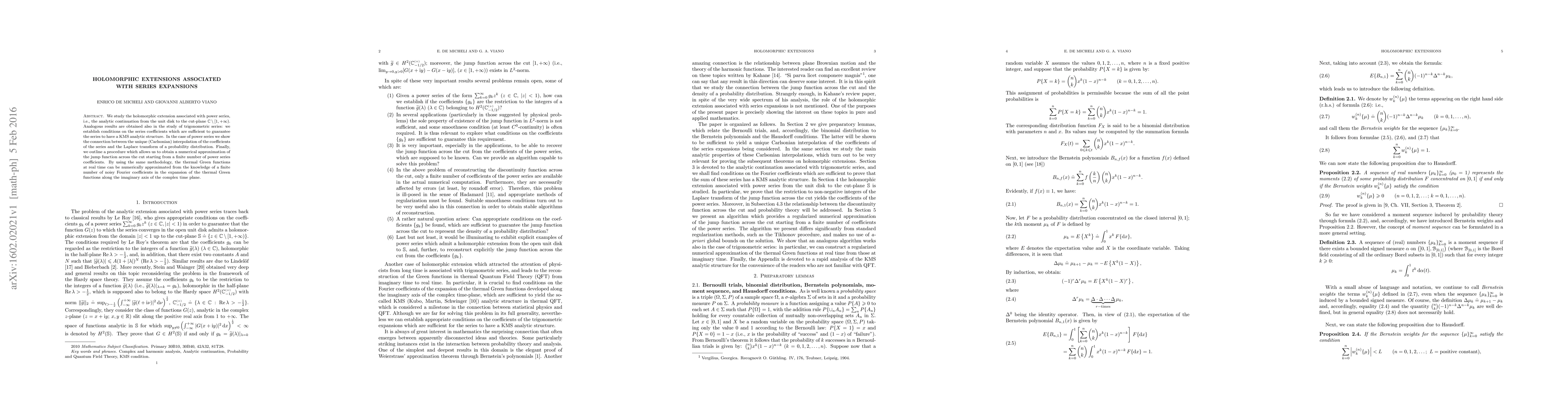 This paper investigates the holomorphic extension of power series and trigonometric series via analytic continuation, establishing conditions for KMS analytic structure. It connects unique interpolation of series coefficients to the Laplace transform of a probability distribution and outlines a method for numerical approximation of jump functions across the cut.