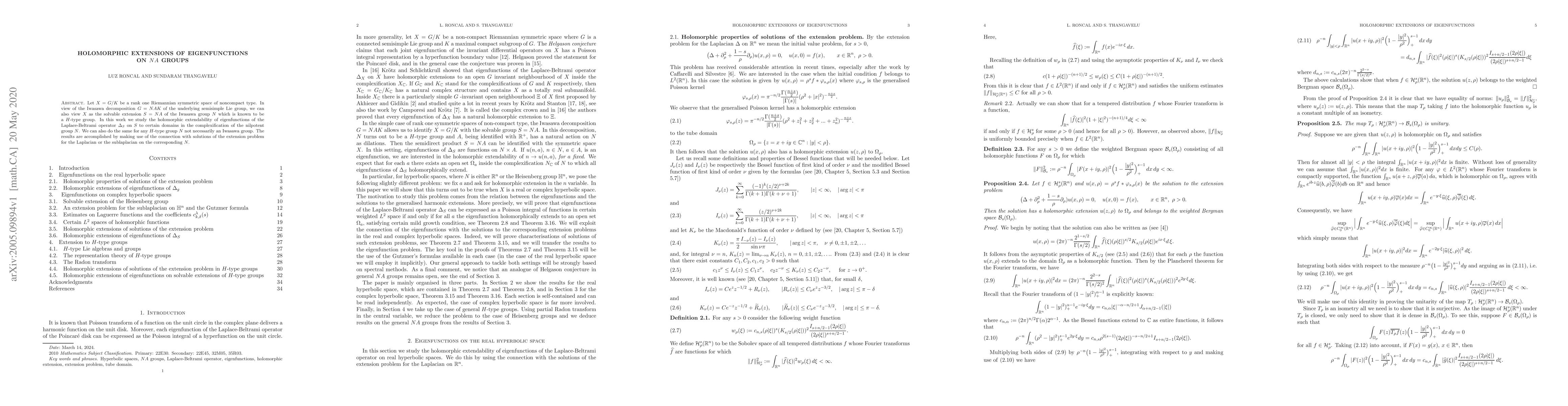 Let $ X = G/K $ be a rank one Riemannian symmetric space of noncompact type. In view of the Iwasawa decomposition $ G = NAK $ of the underlying semisimple Lie group, we can also view $ X $ as the solvable extension $ S = NA $ of the Iwasawa group $ N$ which is known to be a $H$-type group. In this work we study the holomorphic extendability of eigenfunctions of the Laplace-Beltrami operator $ \Delta_S$ on $ S $ to certain domains in the complexification of the nilpotent group $ N$. We can also do the same for any $H$-type group $ N $ not necessarily an Iwasawa group. The results are accomplished by making use of the connection with solutions of the extension problem for the Laplacian or the sublaplacian on the corresponding $ N$.