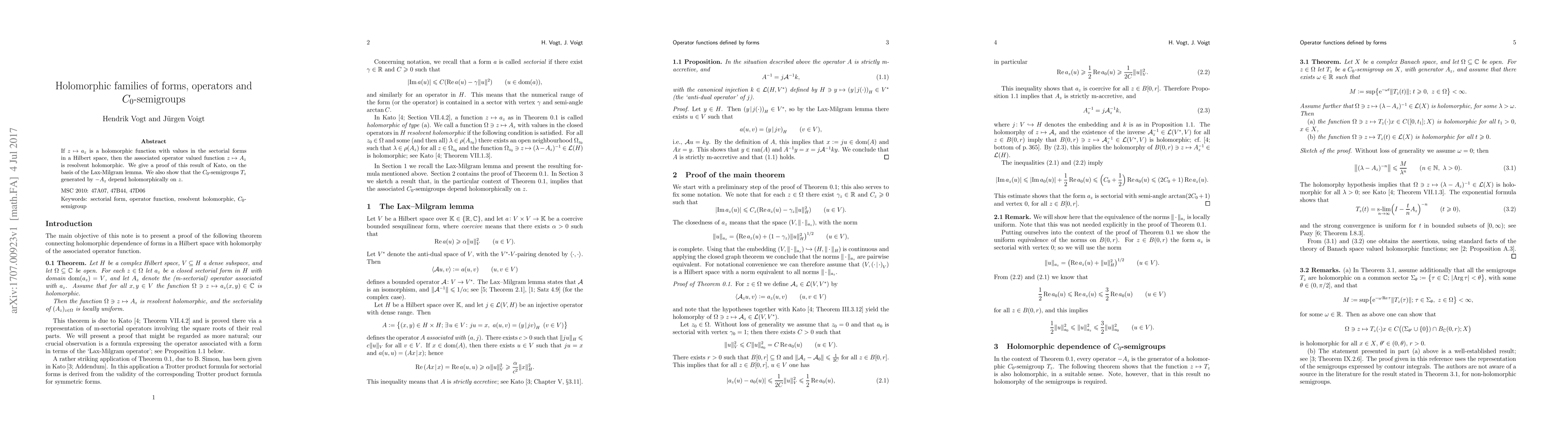 If $z\mapsto a_z$ is a holomorphic function with values in the sectorial forms in a Hilbert space, then the associated operator valued function $z\mapsto A_z$ is resolvent holomorphic. We give a proof of this result of Kato, on the basis of the Lax-Milgram lemma. We also show that the $C_0$-semigroups $T_z$ generated by $-A_z$ depend holomorphically on $z$.