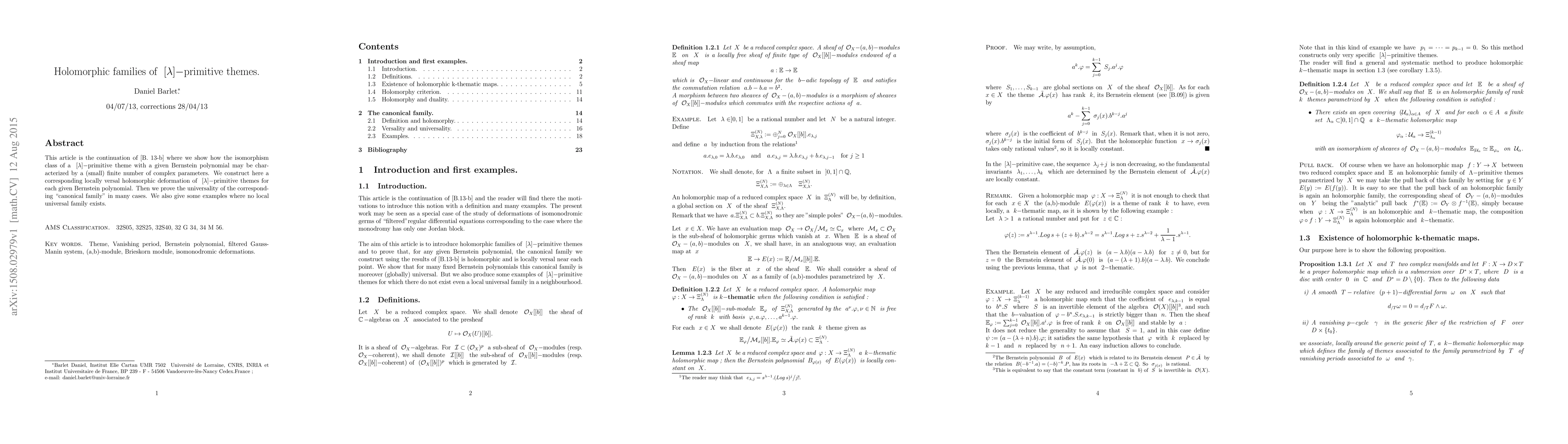 This paper characterizes $[ au]-$primitive themes using holomorphic families of parameters, providing a new approach to understanding their structure and universality.