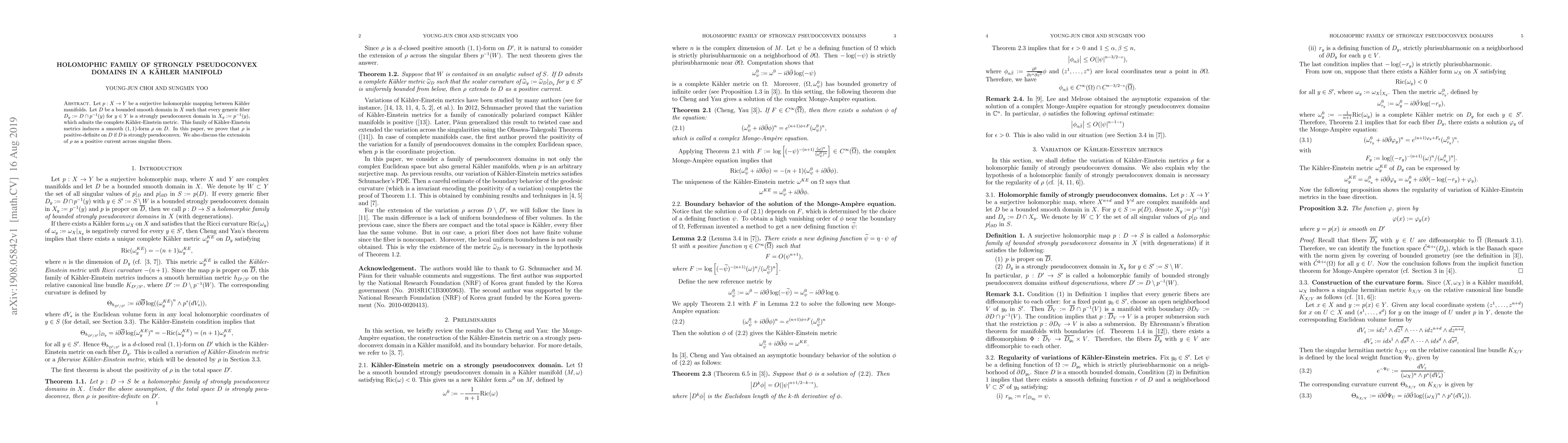 This paper investigates holomorphic families of strongly pseudoconvex domains in Kähler manifolds, proving that a smooth $(1,1)$-form $\rho$ induced by Kähler-Einstein metrics is positive-definite on strongly pseudoconvex domains. It also extends $\rho$ as a positive current across singular fibers.