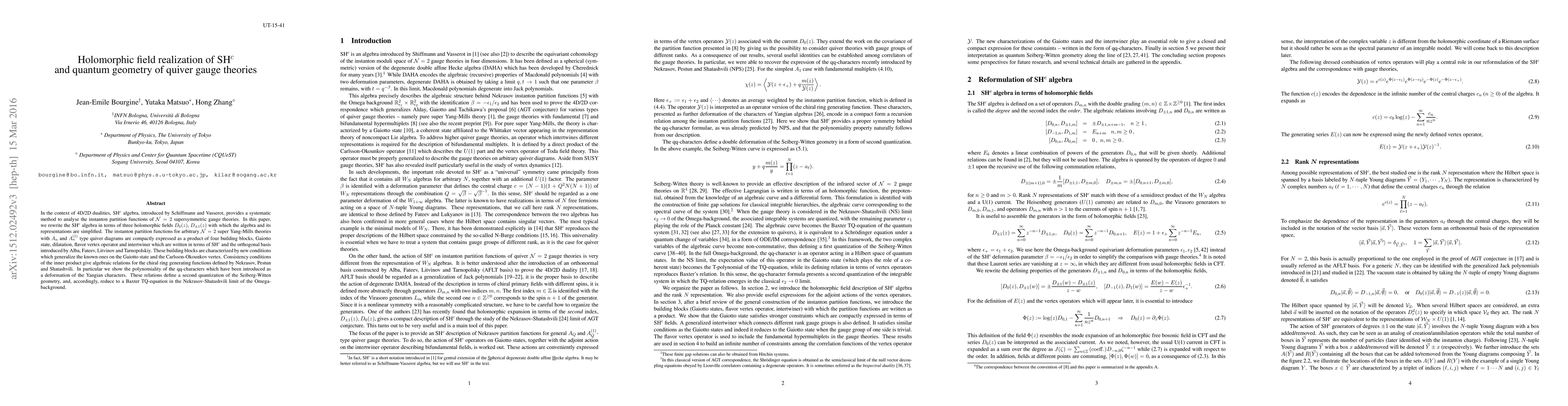 In the context of 4D/2D dualities, SH$^c$ algebra, introduced by Schiffmann and Vasserot, provides a systematic method to analyse the instanton partition functions of $\mathcal{N}=2$ supersymmetric gauge theories. In this paper, we rewrite the SH$^c$ algebra in terms of three holomorphic fields $D_0(z)$, $D_{\pm1}(z)$ with which the algebra and its epresentations are simplified. The instanton partition functions for arbitrary $\mathcal{N}=2$ super Yang-Mills theories with $A_n$ and $A^{(1)}_n$ type quiver diagrams are compactly expressed as a product of four building blocks: Gaiotto state, dilatation, flavor vertex operator and intertwiner which are written in terms of SH$^c$ and the orthogonal basis introduced by Alba, Fateev, Litvinov and Tarnopolskiy. These building blocks are characterized by new conditions which generalize the known ones on the Gaiotto state and the Carlsson-Okounkov vertex. Consistency conditions of the inner product give algebraic relations for the chiral ring generating functions defined by Nekrasov, Pestun and Shatashvili. In particular we show the polynomiality of the qq-characters which have been introduced as a deformation of the Yangian characters. These relations define a second quantization of the Seiberg-Witten geometry, and, accordingly, reduce to a Baxter TQ-equation in the Nekrasov-Shatashvili limit of the Omega-background.