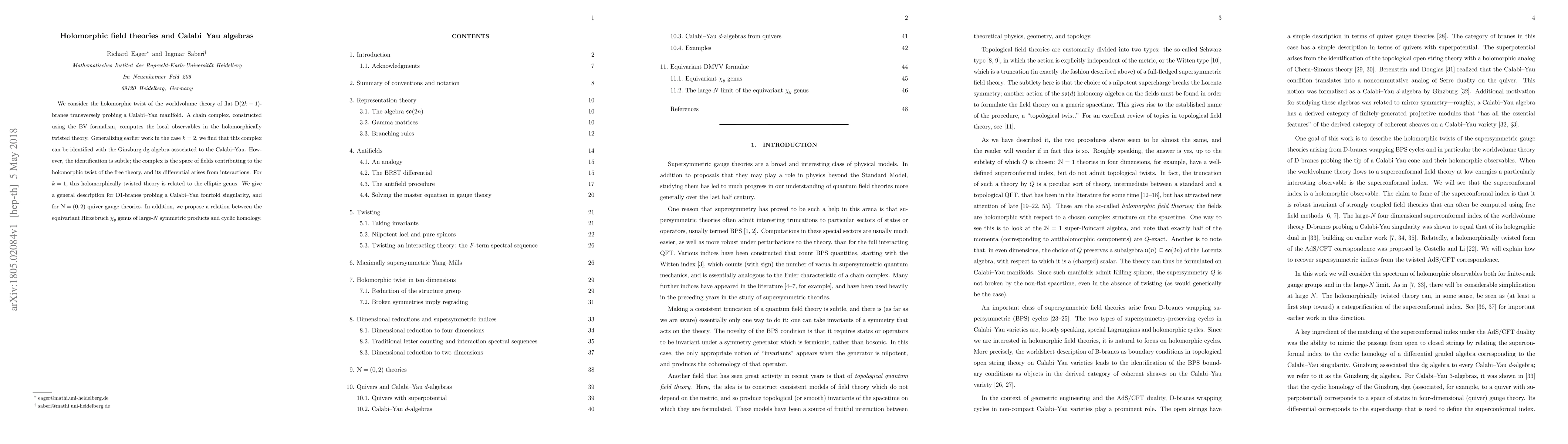 This research paper explores holomorphic field theories linked to Calabi-Yau manifolds, using a chain complex derived from the BV formalism to compute local observables. The complex is shown to correspond to the Ginzburg dg algebra of the Calabi-Yau, with the differential originating from interactions. The study extends previous work for k=2 to k=1, connecting the holomorphically twisted theory to the elliptic genus. It also provides descriptions for D1-branes on Calabi-Yau fourfold singularities and (0,2) quiver gauge theories, proposing a link between equivariant Hirzebruch genus and cyclic homology.