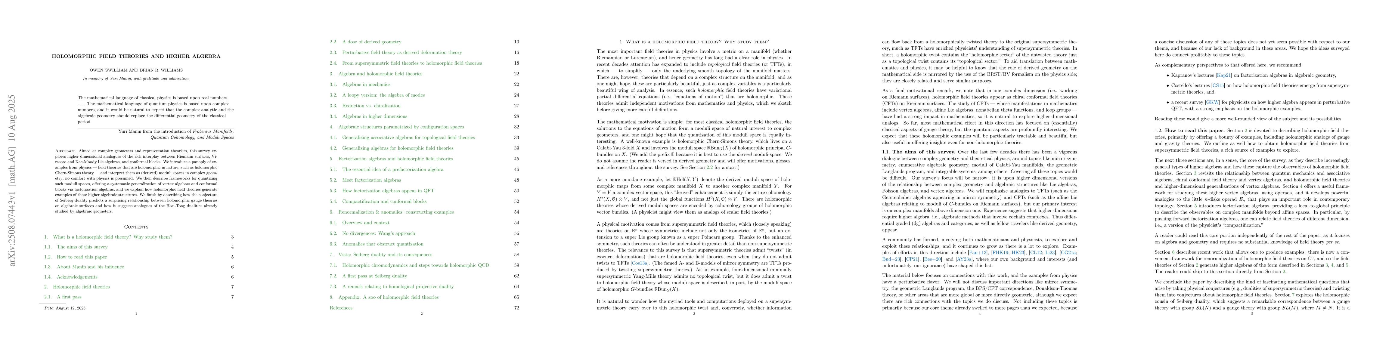 Aimed at complex geometers and representation theorists, this survey explores higher dimensional analogues of the rich interplay between Riemann surfaces, Virasoro and Kac-Moody Lie algebras, and conformal blocks. We introduce a panoply of examples from physics -- field theories that are holomorphic in nature, such as holomorphic Chern-Simons theory -- and interpret them as (derived) moduli spaces in complex geometry; no comfort with physics is presumed. We then describe frameworks for quantizing such moduli spaces, offering a systematic generalization of vertex algebras and conformal blocks via factorization algebras, and we explain how holomorphic field theories generate examples of these higher algebraic structures. We finish by describing how the conjecture of Seiberg duality predicts a surprising relationship between holomorphic gauge theories on algebraic surfaces and how it suggests analogues of the Hori-Tong dualities already studied by algebraic geometers.