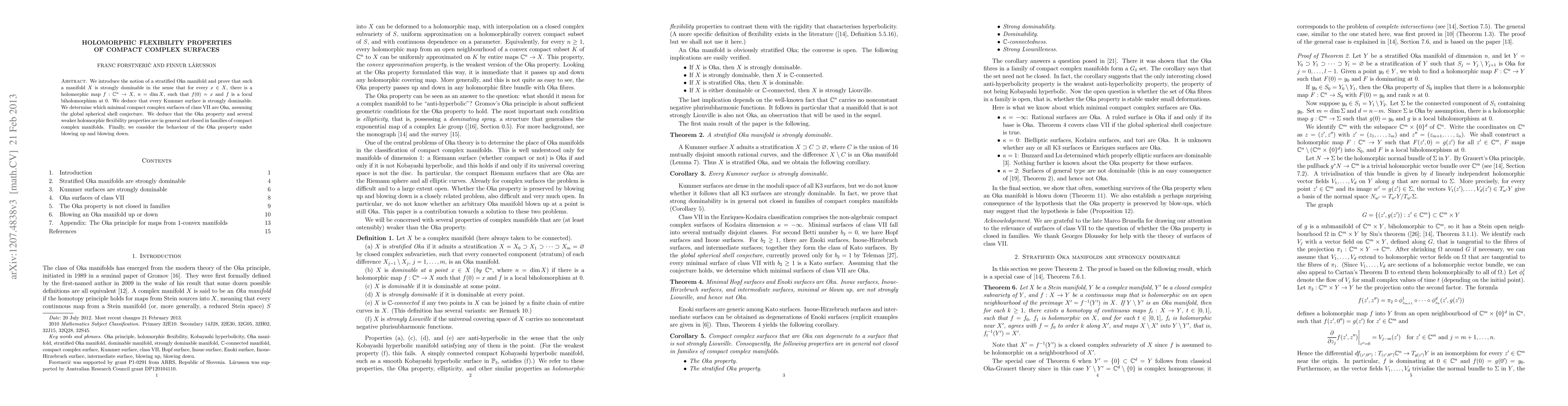 This paper explores the holomorphic flexibility properties of compact complex surfaces, introducing the concept of stratified Oka manifolds. It proves that such manifolds are strongly dominable, demonstrating that Kummer surfaces and certain minimal surfaces of class VII possess this property, contingent on the global spherical shell conjecture. The study also examines the inheritance of the Oka property through blowing up and down, concluding that these properties are generally not preserved in families of complex manifolds.