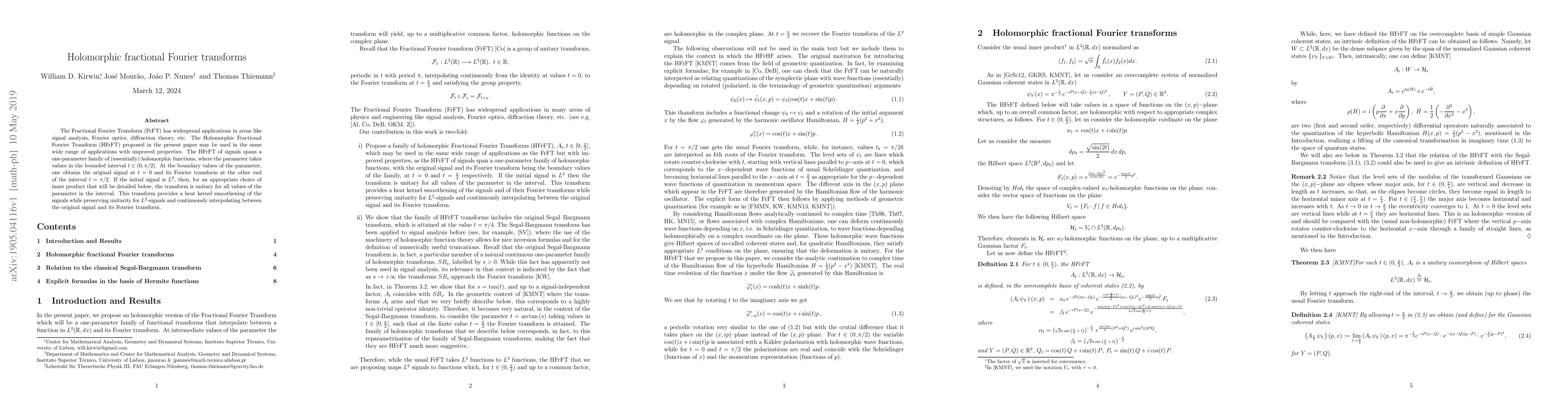 The paper introduces the Holomorphic Fractional Fourier Transform (HFrFT), which extends the Fractional Fourier Transform with improved properties for applications in signal analysis and optics. The HFrFT provides a continuous interpolation between the original signal and its Fourier transform while maintaining unitarity for $L^2$-signals.