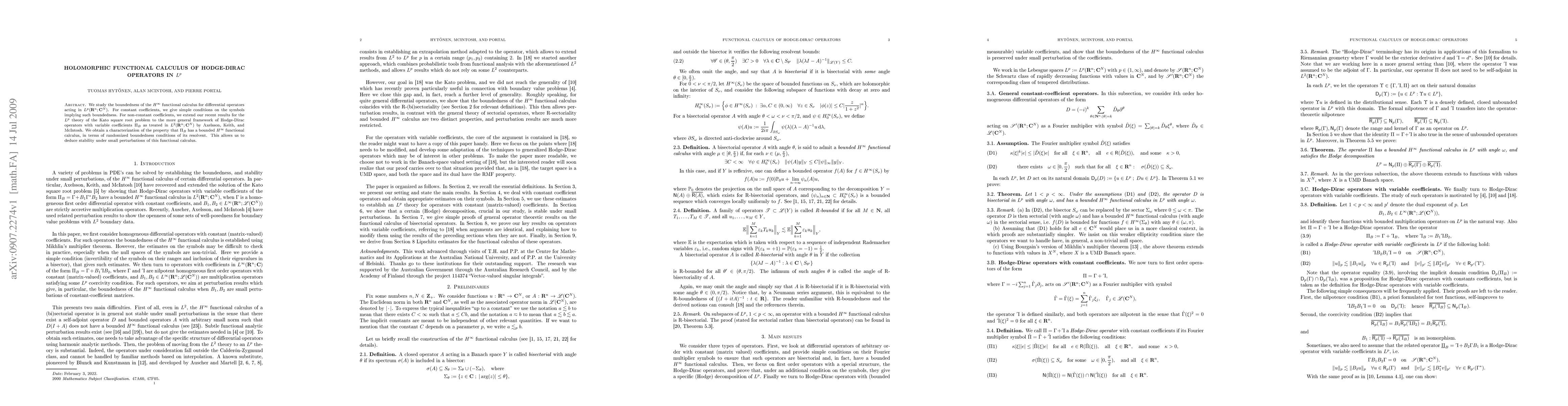 We study the boundedness of the $H^{\infty}$ functional calculus for differential operators acting in (L^{p}(\mathbb{R}^{n};\mathbb{C}^{N})). For constant coefficients, we give simple conditions on the symbols implying such boundedness. For non-constant coefficients, we extend our recent results for the (L^p) theory of the Kato square root problem to the more general framework of Hodge-Dirac operators with variable coefficients (\Pi_B) as treated in (L^2(\mathbb{R}^{n};\mathbb{C}^{N})) by Axelsson, Keith, and McIntosh. We obtain a characterization of the property that (\Pi_B) has a bounded (H^{\infty}) functional calculus, in terms of randomized boundedness conditions of its resolvent. This allows us to deduce stability under small perturbations of this functional calculus.