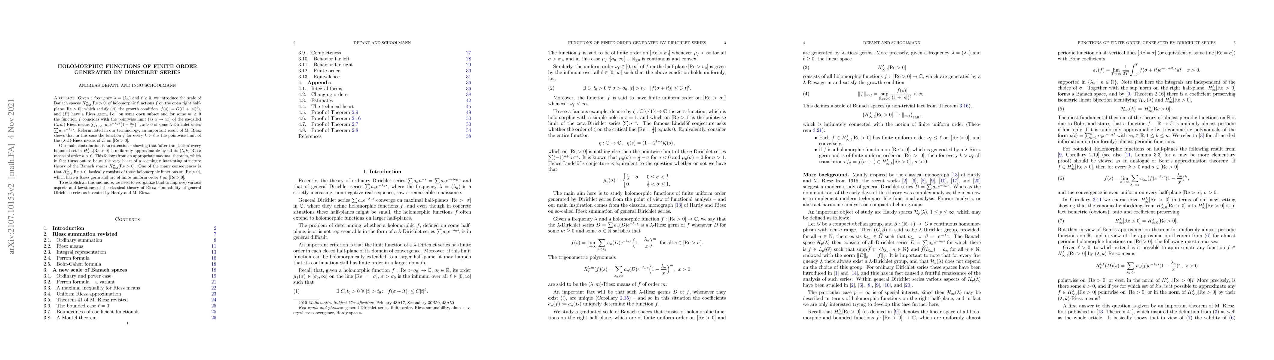 Given a frequency $\lambda = (\lambda_n)$ and $\ell \ge 0$, we introduce the scale of Banach spaces $H_{\infty,\ell}^{\lambda}[Re > 0]$ of holomorphic functions $f$ on the open right half-plane $[Re > 0]$, which satisfy $(A)$ the growth condition $|f(s)| = O((1 + |s|)^\ell)$, and $(B)$ have a Riesz germ, i.e. on some open subset and for some $m \ge 0$ the function $f$ coincides with the pointwise limit (as $x \to \infty$) of the so-called $(\lambda,m)$-Riesz means $\sum_{\lambda_n < x} a_n e^{-\lambda_n s}\big( 1-\frac{\lambda_n}{x}\big)^m ,\,x >0$ of some $\lambda$-Dirichlet series $\sum a_n e^{-\lambda_n s}$. Reformulated in our terminology, an important result of M. Riesz shows that in this case the function $f$ for every $k >\ell$ is the pointwise limit of the $(\lambda,k)$-Riesz means of $D$ on $[Re > 0]$. Our main contribution is an extension -- showing that 'after translation' every bounded set in $H_{\infty,\ell}^{\lambda}[Re > 0]$ is uniformly approximable by all its $(\lambda,k)$-Riesz means of order $k>\ell$. This follows from an appropriate maximal theorem, which in fact turns out to be at the very heart of a seemingly interesting structure theory of the Banach spaces $H_{\infty,\ell}^{\lambda}[Re > 0]$. One of the many consequences is that $H_{\infty,\ell}^{\lambda}[Re > 0]$ basically consists of those holomorphic functions on $[Re >0]$, which have a Riesz germ and are of finite uniform order $\ell$ on $[Re >0]$. To establish all this and more, we need to reorganize (and to improve) various aspects and keystones of the classical theory of Riesz summability of general Dirichlet series as invented by Hardy and M. Riesz.