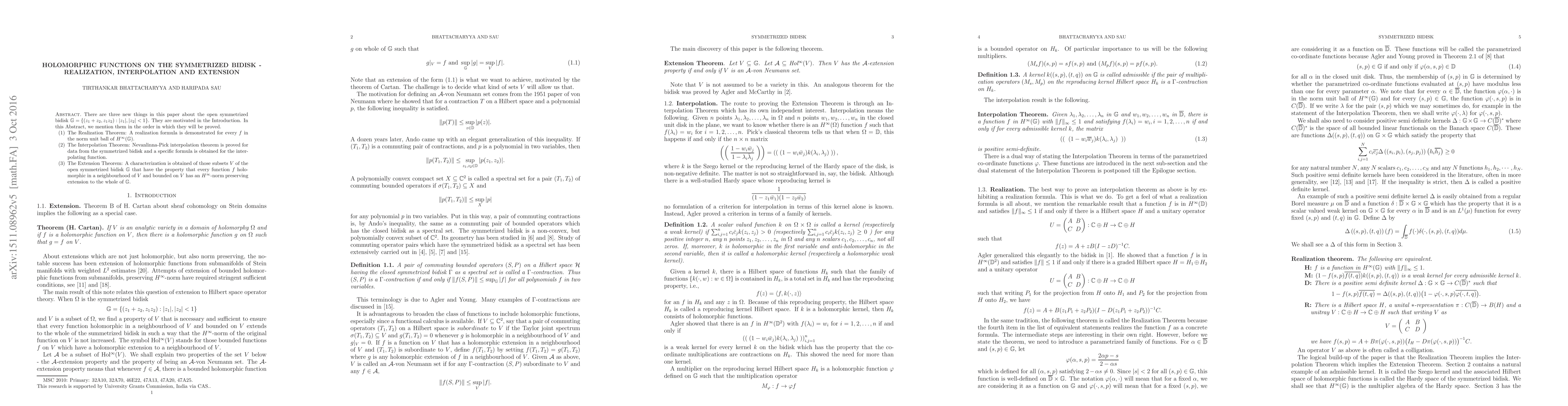 There are three new things in this paper about the open symmetrized bidisk $\mathbb G = \{(z_1+z_2, z_1z_2) : |z_1|, |z_2| < 1\}$. They are motivated in the Introduction. In this Abstract, we mention them in the order in which they will be proved. \begin{enumerate} \item The Realization Theorem: A realization formula is demonstrated for every $f$ in the norm unit ball of $H^\infty(\mathbb G)$. \item The Interpolation Theorem: Nevanlinna-Pick interpolation theorem is proved for data from the symmetrized bidisk and a specific formula is obtained for the interpolating function. \item The Extension Theorem: A characterization is obtained of those subsets $V$ of the open symmetrized bidisk $\mathbb G$ that have the property that every function $f$ holomorphic in a neighbourhood of $V$ and bounded on $V$ has an $H^\infty$-norm preserving extension to the whole of $\mathbb G$. \end{enumerate}